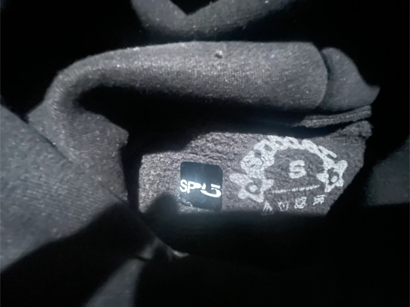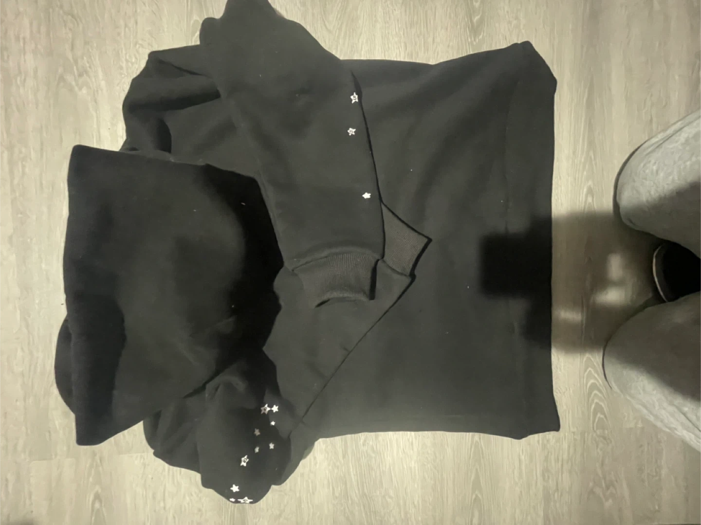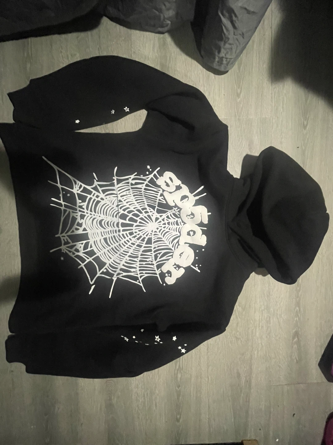 Black Sp5der hoodie with a white spider web graphic on the front and stars on the sleeves. It's a size small and made in Los Angeles. Material is a comfortable cotton blend.