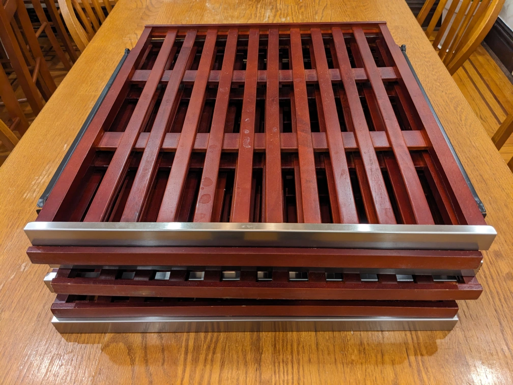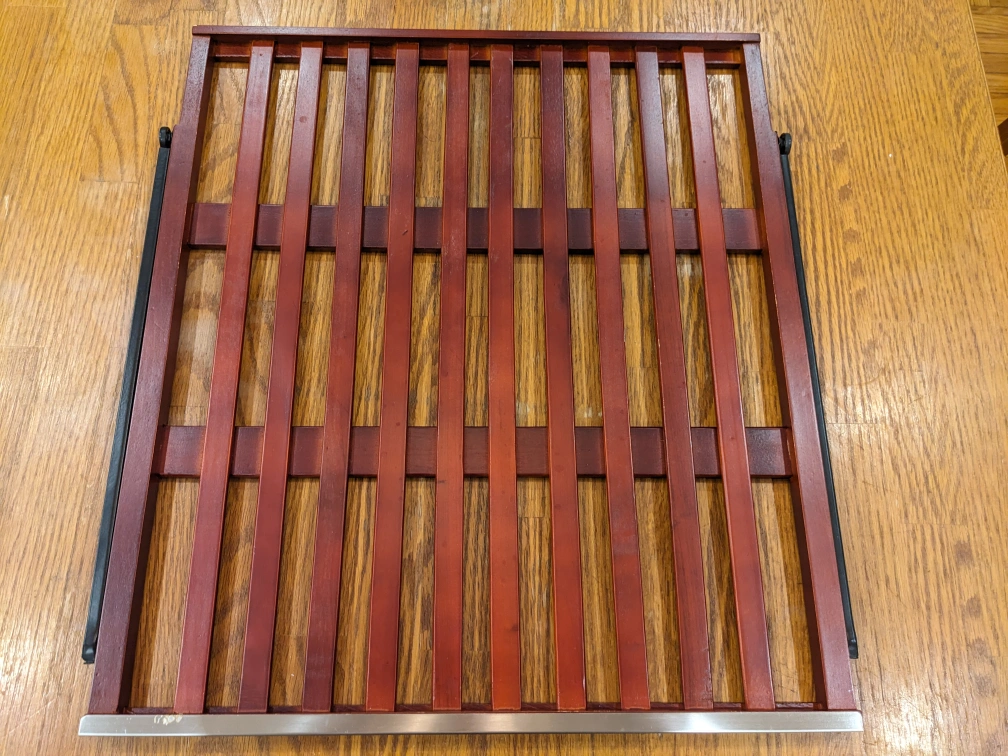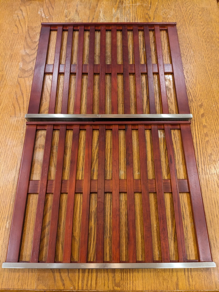 A set of wine fridge racks from a Danby silhouette. The racks are in good shape, might just need a wipe down. Beautiful cherry wood colour but I'm not 100% sure it it's actually cherry wood.