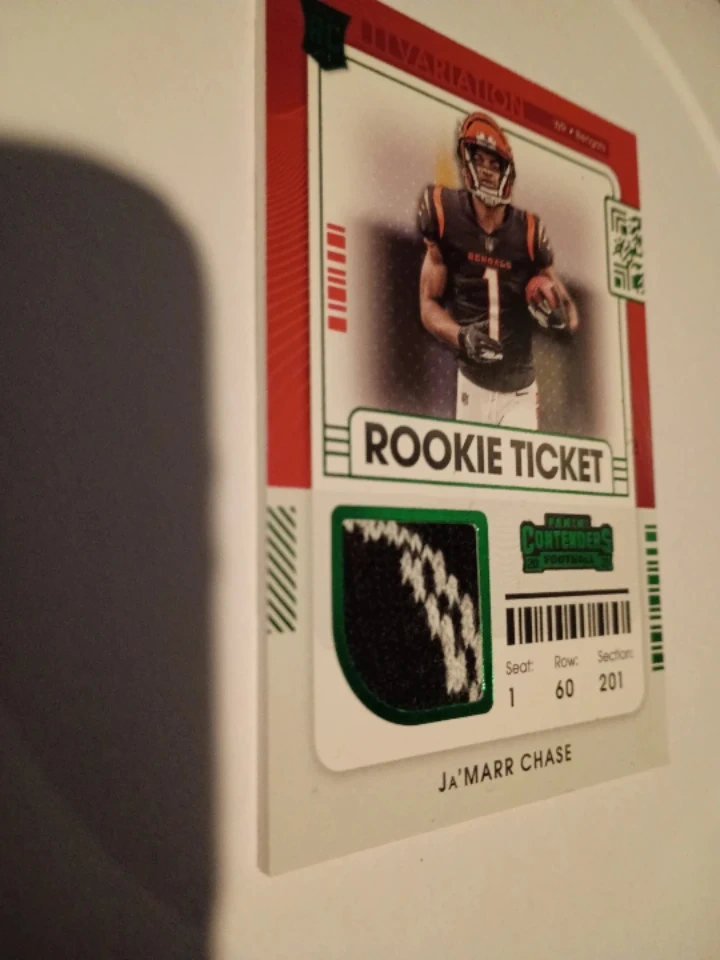 Panini Contenders Rookie Ticket card featuring Ja'Marr Chase. Includes a patch of material on the card. Seat, Row, and Section information are printed on the card.