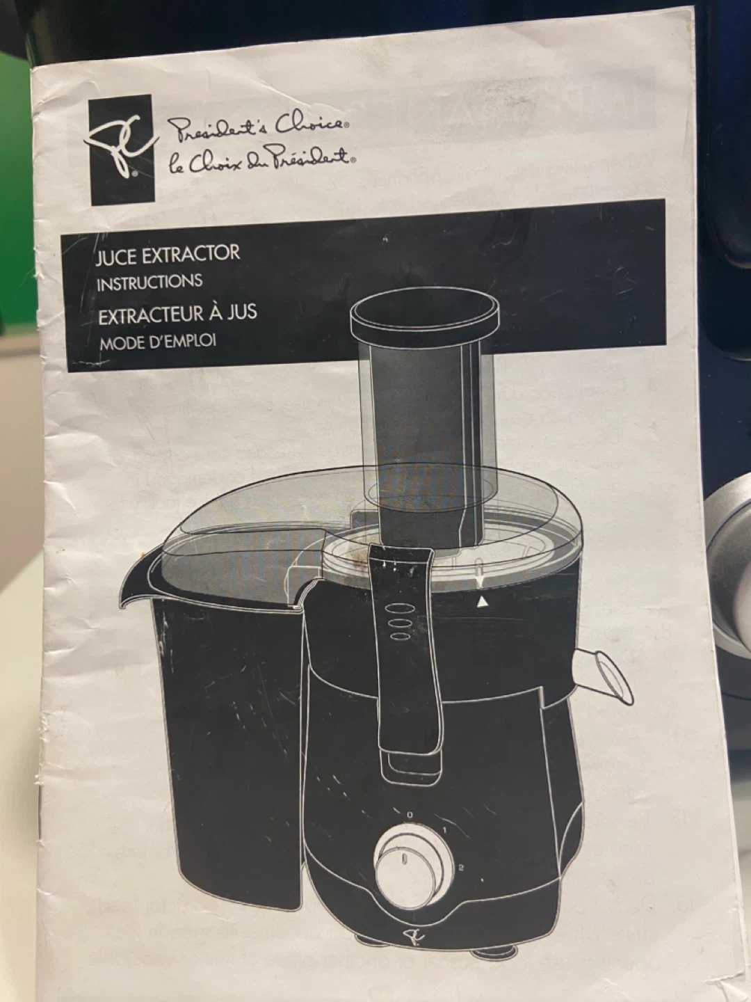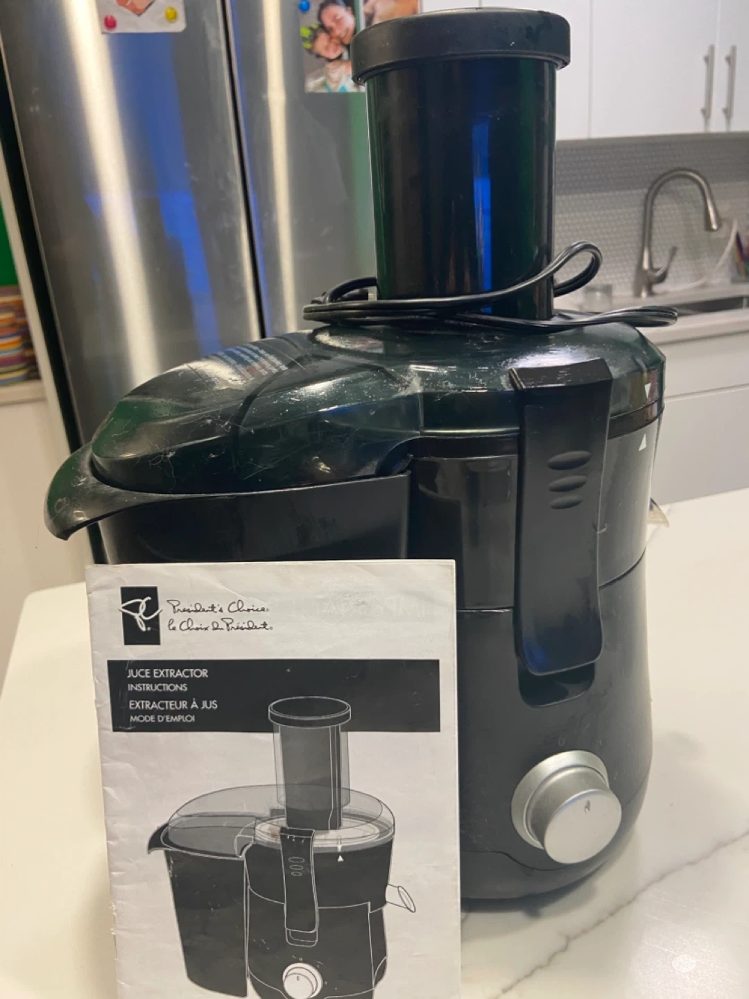 This is a President's Choice juice extractor. It's a handy appliance for making fresh juice. Instructions are included.Efficient , easy to clean.