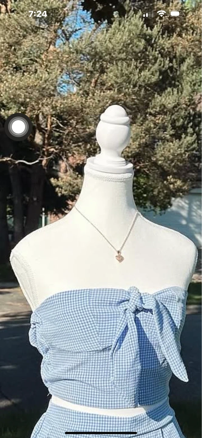 Strapless blue gingham top with a tie front. Includes a delicate heart pendant necklace. Fabric is cotton blend.