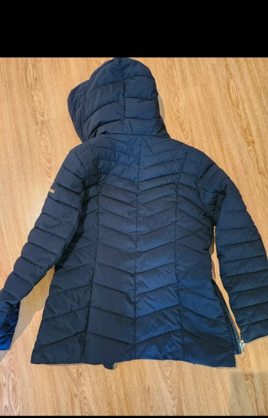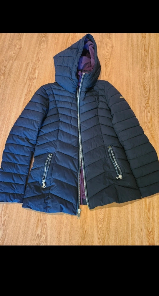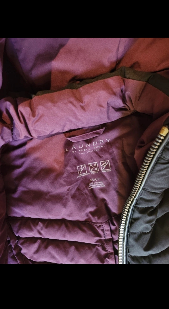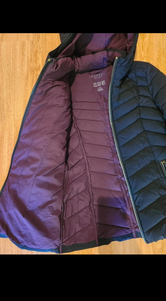 Selling a women's Laundry winter jacket, size small. Windproof. Gently used but is in like new conditon. Smoke free/pet free home. Zippers are gold colored. Inside the jacket is a deep purple color. Hits below waist (for reference, I am 5"4). $30