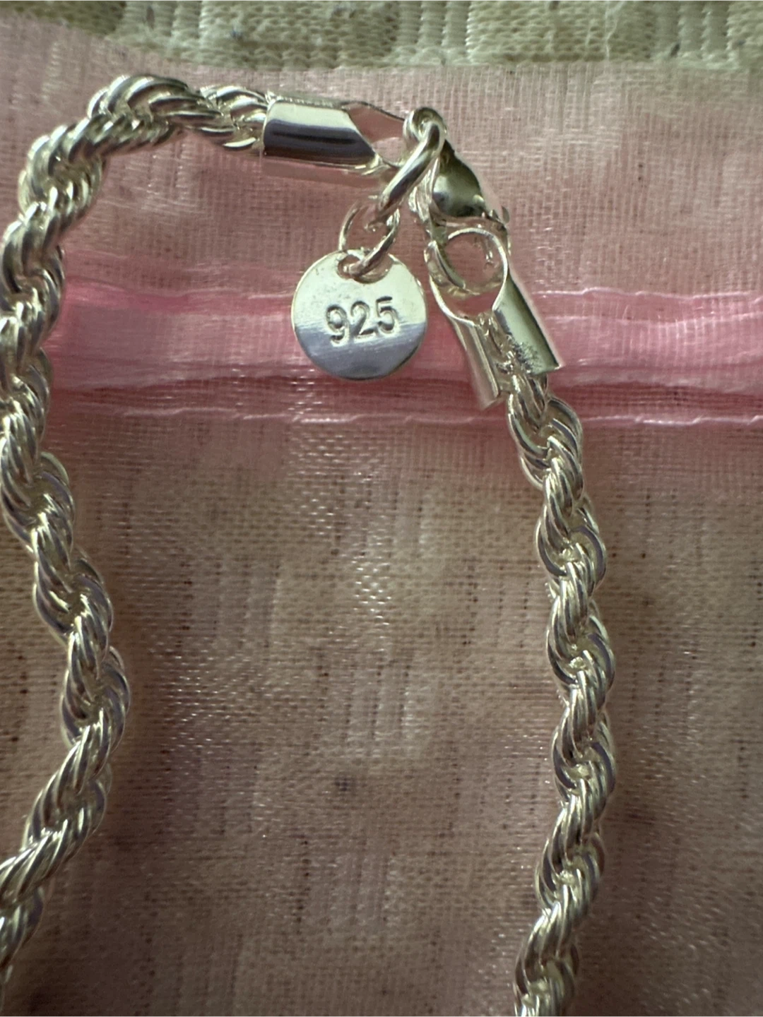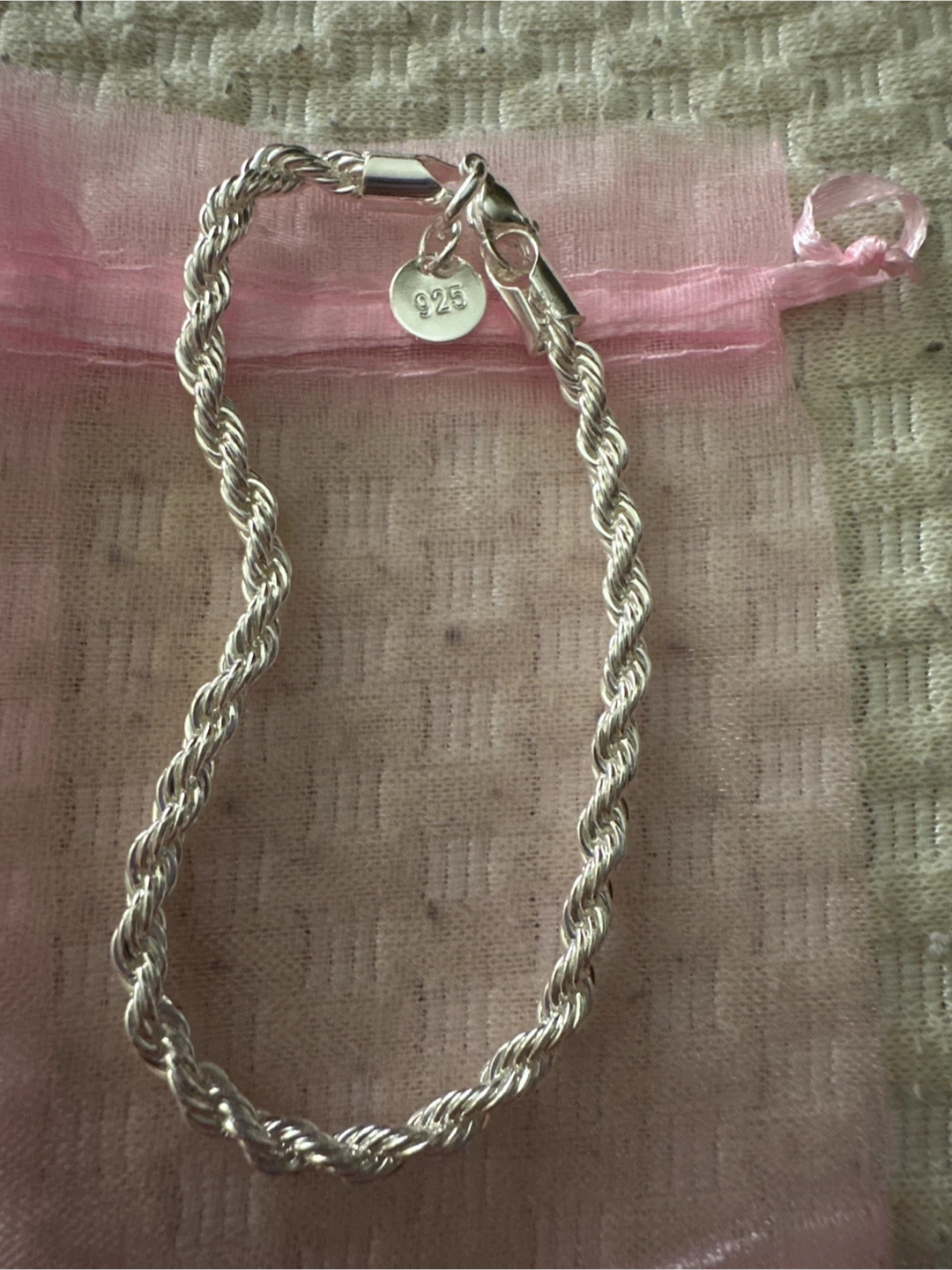 This is a 925 sterling silver rope chain bracelet. It's a timeless piece with a classic design. The metal is sterling silver, stamped with '925' indicating its purity. It comes with a secure clasp for easy wear.