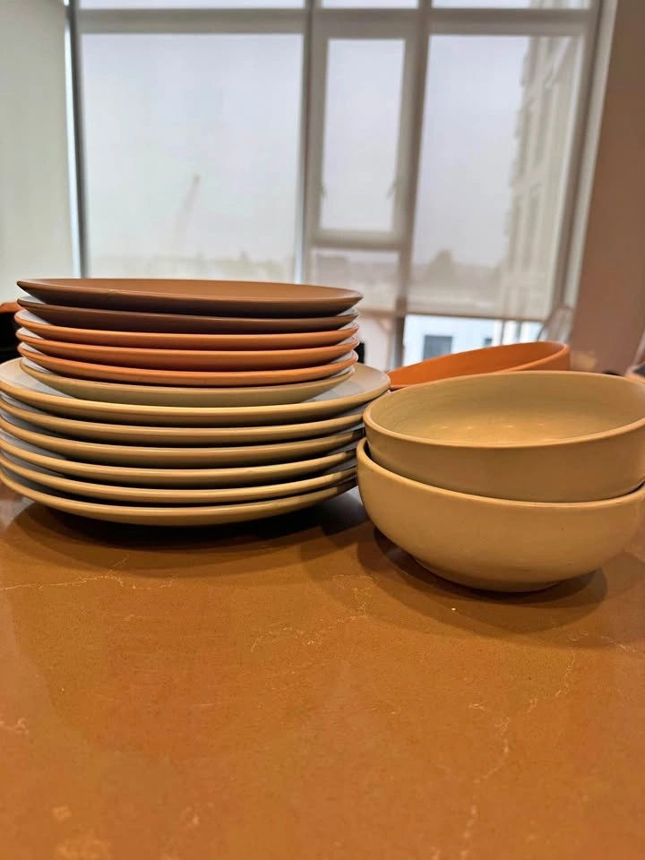 Mismatched plate set with 6 dinner plates, 6 small plates, and 4 bowls. Some marking on the dishes from use. Pick up downtown Victoria.