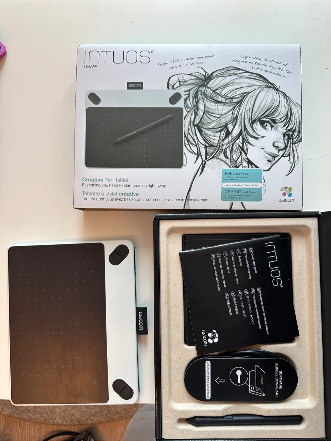 This is a Wacom Intuos Draw creative pen tablet, perfect for digital art. It includes the pen tablet, stylus, and included software download. It's designed for sketching, drawing, and painting on your computer.