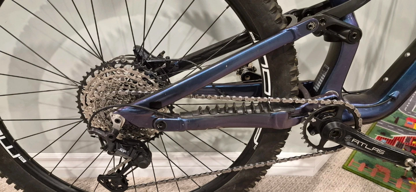 Carbon frame. RockShox Lyrik Select+ fork (150mm) with SKF seals and 2021 updates, and RockShox Super Deluxe Select+ rear shock (130mm). Deore 4-piston brakes, XT rear derailleur, and SLX shifter. 1x12 drivetrain. OneUp V2 210mm dropper post with new seals. Stans Flow EX3 wheels with Industry 9 1/1 hubs. New Continental Kryptotal tires front and rear (black). Pedals not included. All original manuals are available in digital format for the bike, suspension, and rear hub, including rebuild manuals.