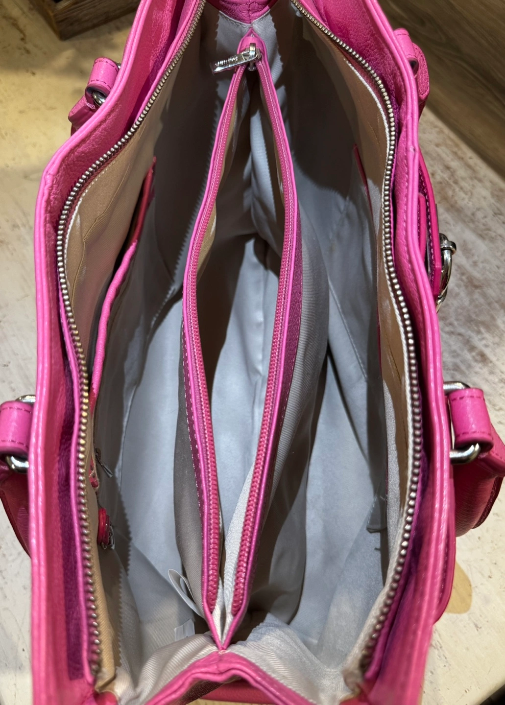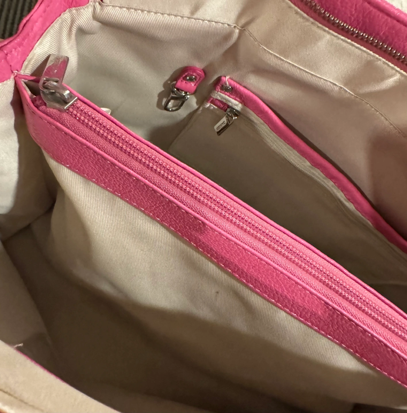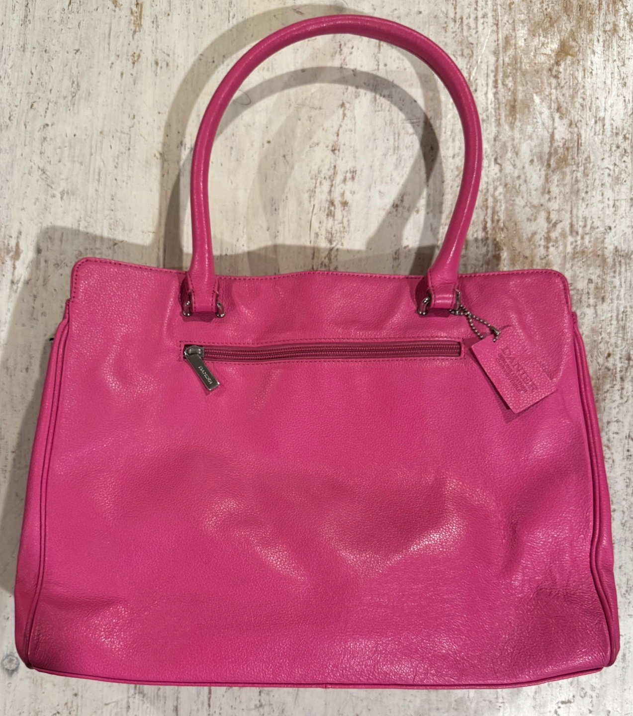 Vintage Danier Leather Pink leather tote bag. Features a top zip closure, two top handles, and multiple interior compartments.