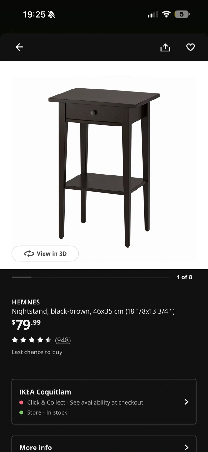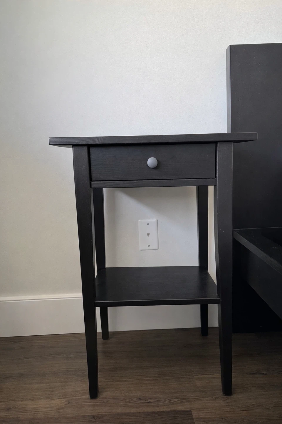 2 Black nightstands featuring one drawer for storage. It has an open shelf below the drawer. Dark wood finish. Brand new! Used for only 2 months. Each was purchased for $80+tax.