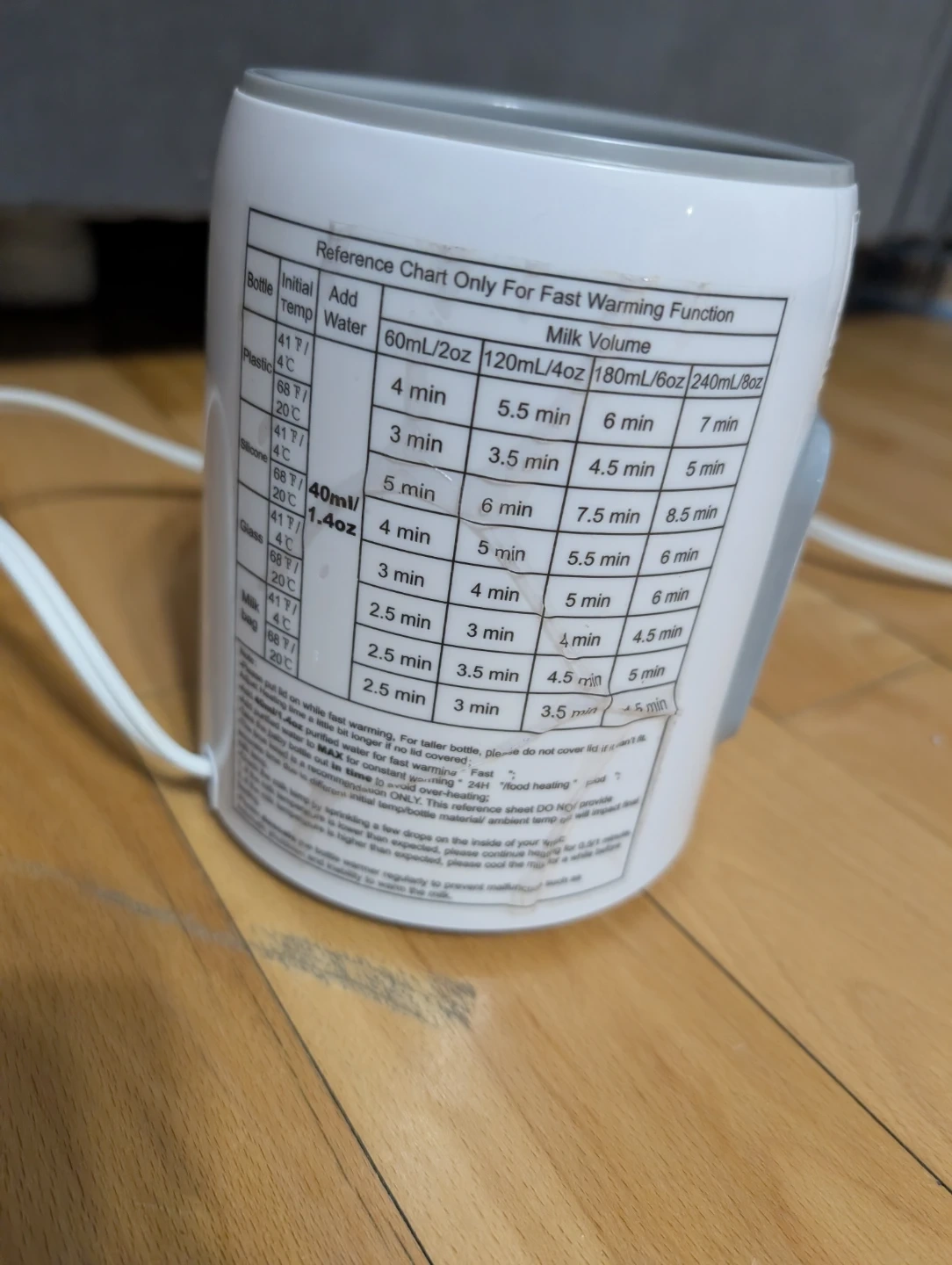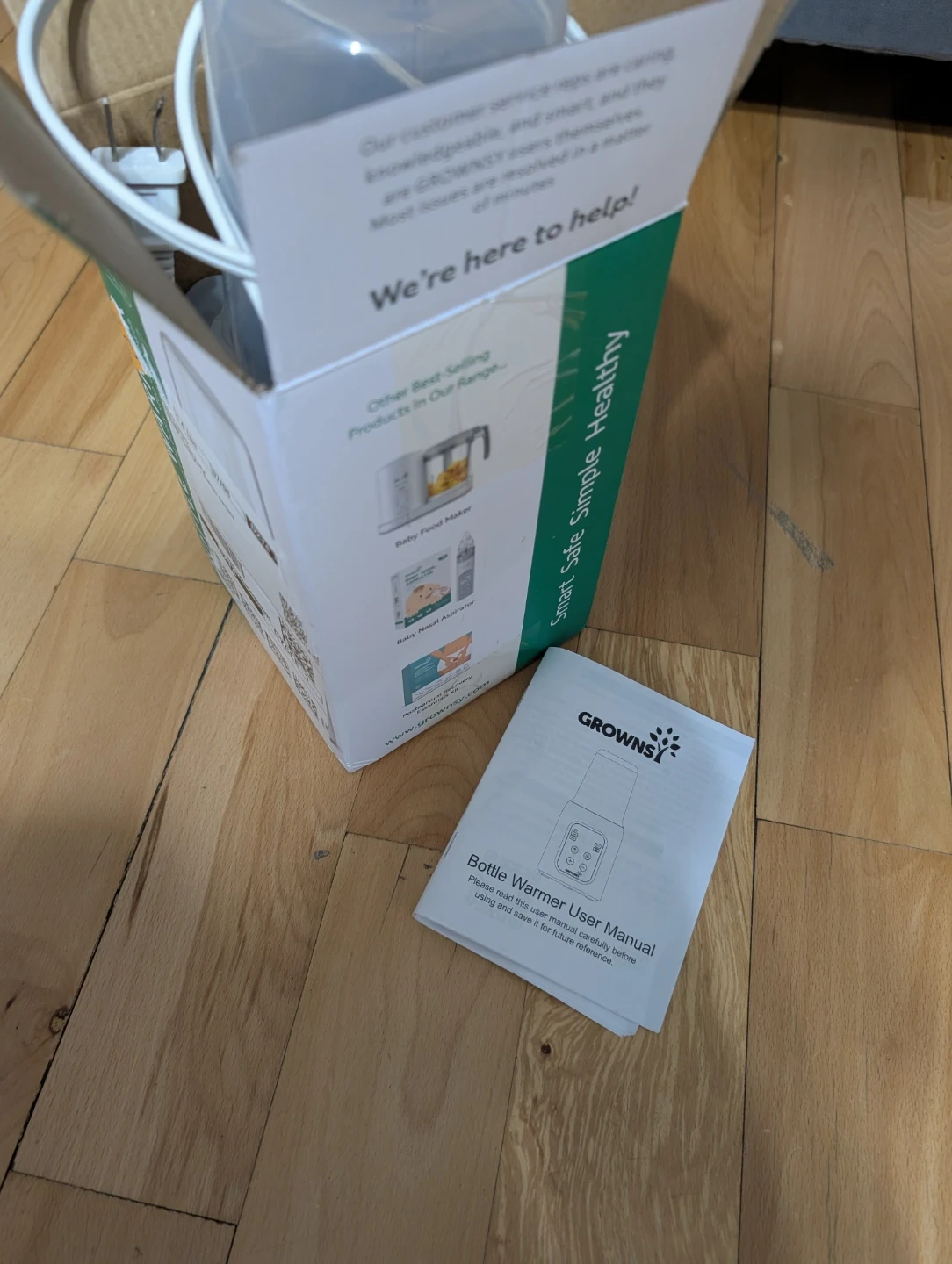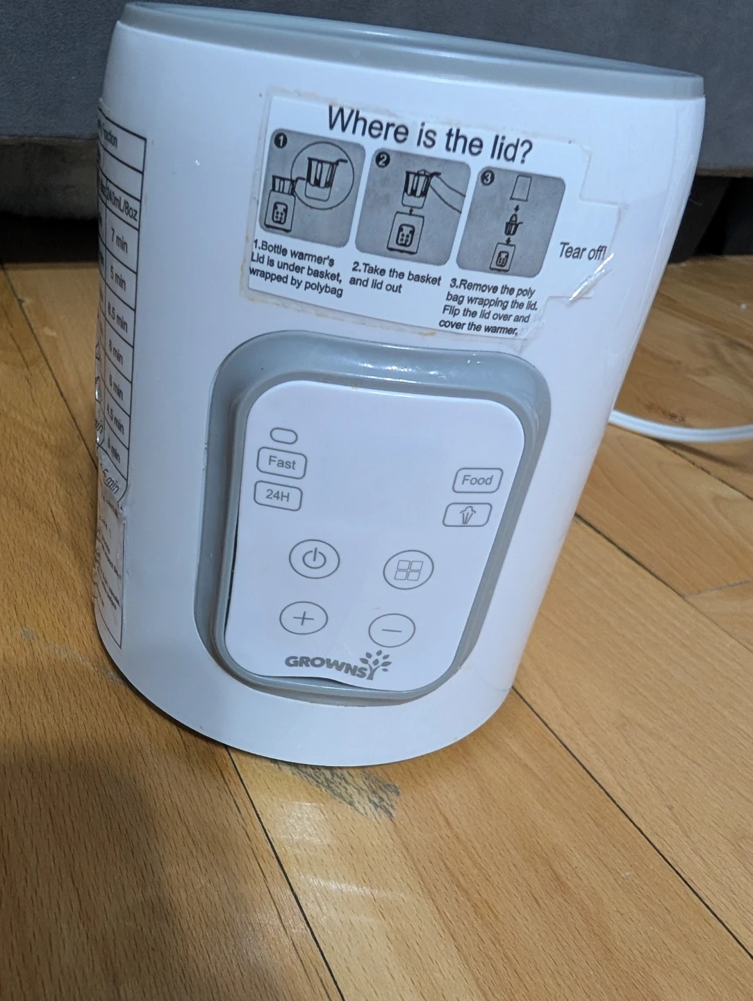 Chauffe-biberon GROWSY blanc. Différentes fonctions disponibles, incluant réchauffement rapide et maintien au chaud. Manuels d'utilisation inclus.