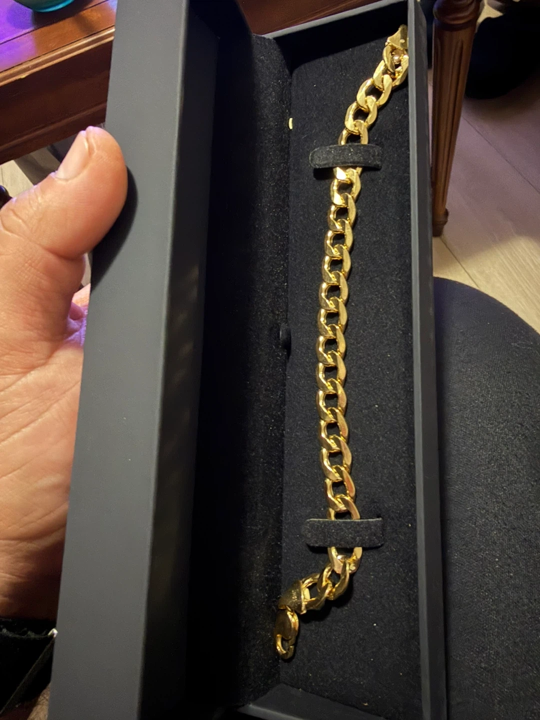 This is a 11.3mm curb chain bracelet in 10K gold. It measures 9 inches in length and comes in its original box. It's a classic piece for everyday wear!