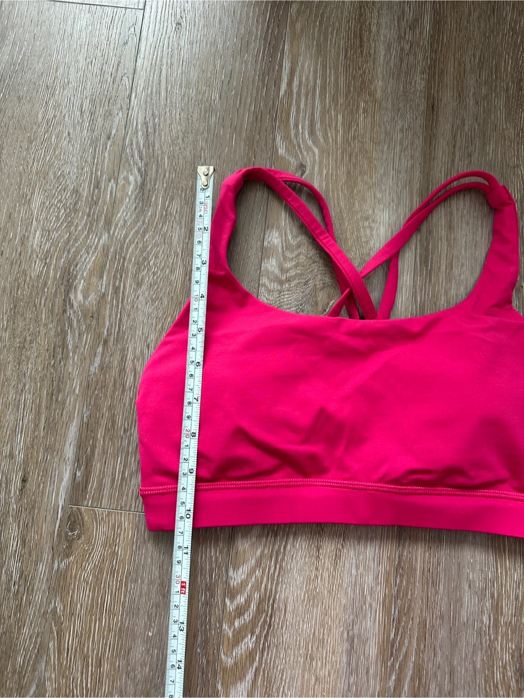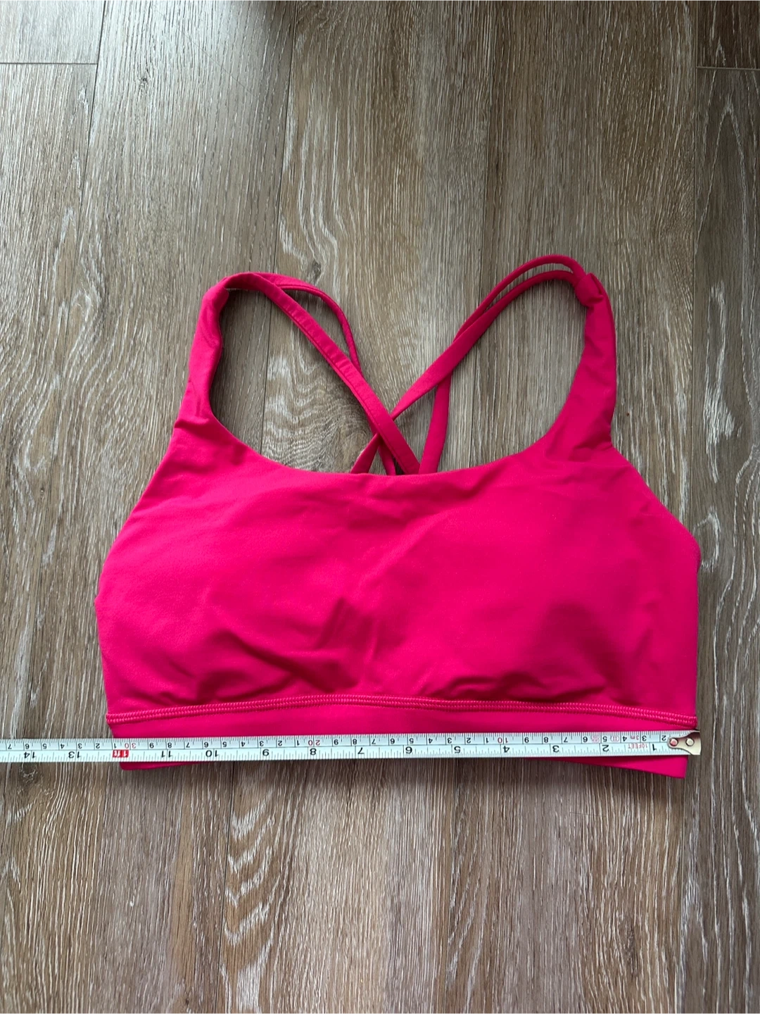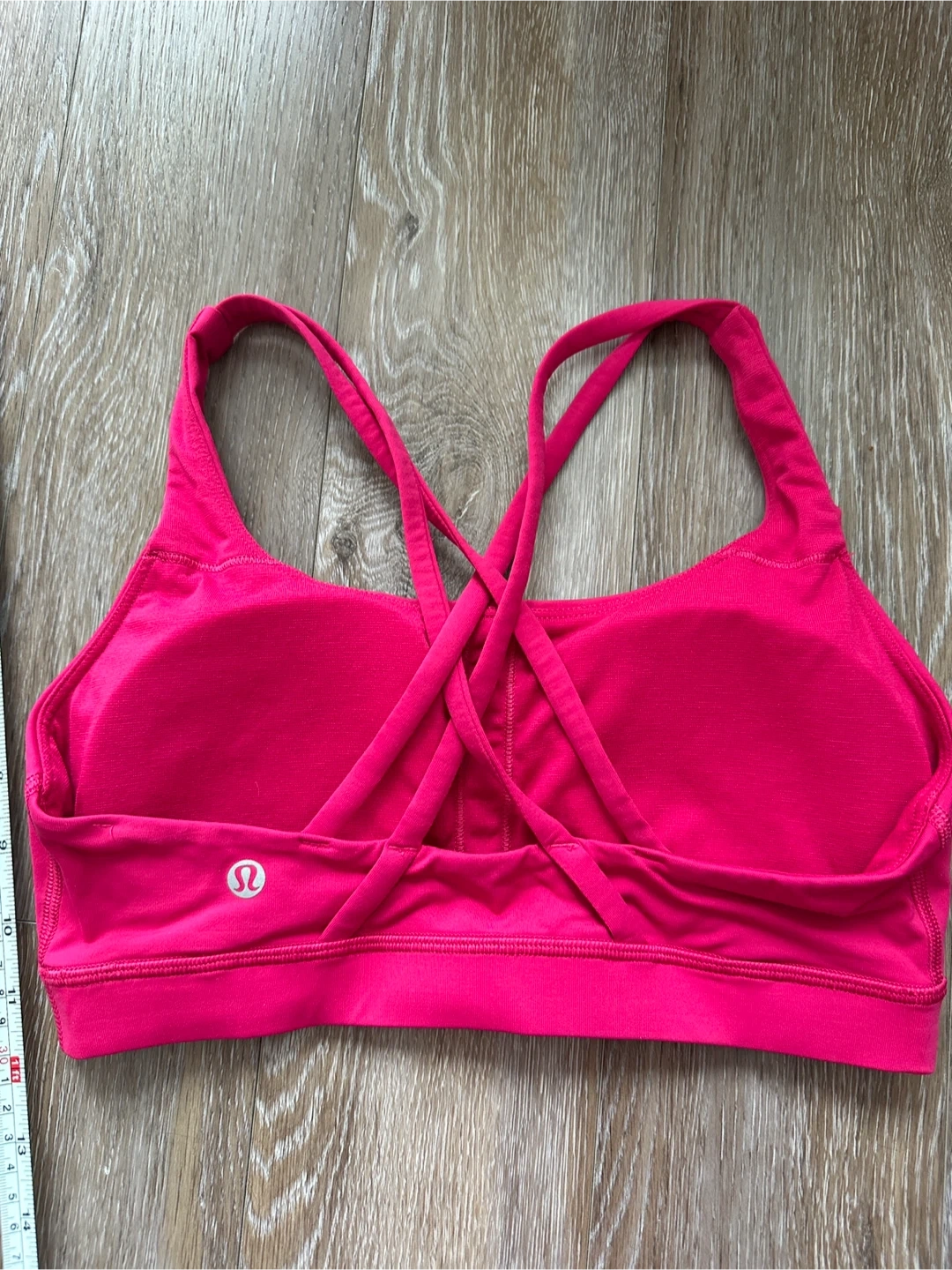 This Lululemon sports bra is a vibrant hot pink colour. It features a criss-cross strap design on the back for added support and style. The material is stretchy and comfortable for workouts. Padded removable cups. Please check pictures for aproximativ measurements.