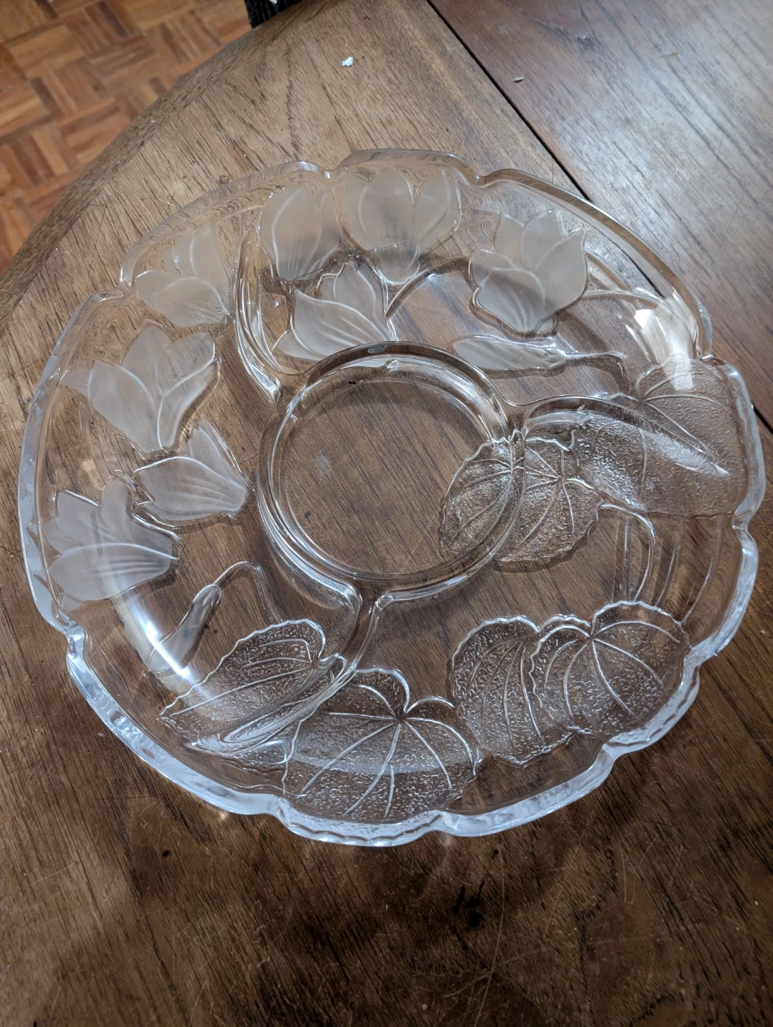 Clear glass serving platter with a frosted floral and leaf design. It includes a removable glass dip bowl that fits in the centre. Perfect for serving appetizers or snacks at a party!