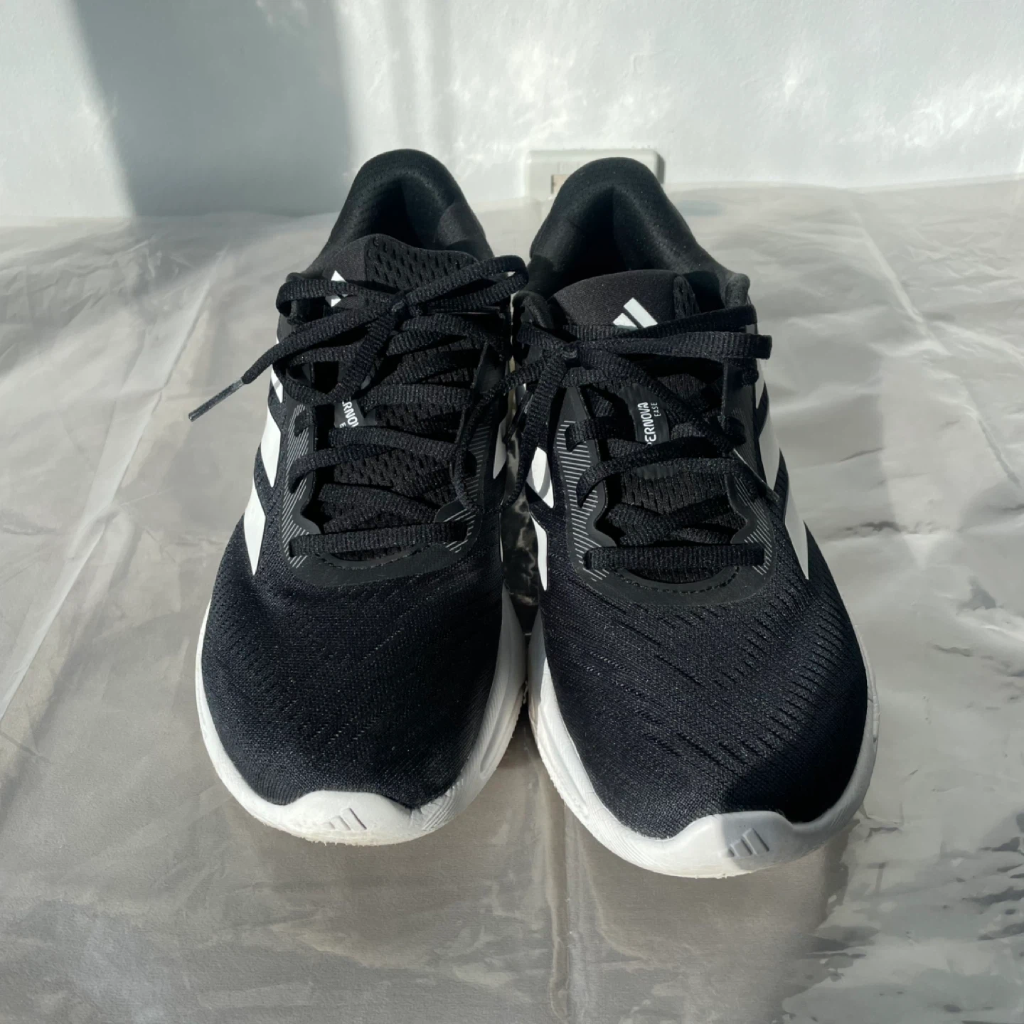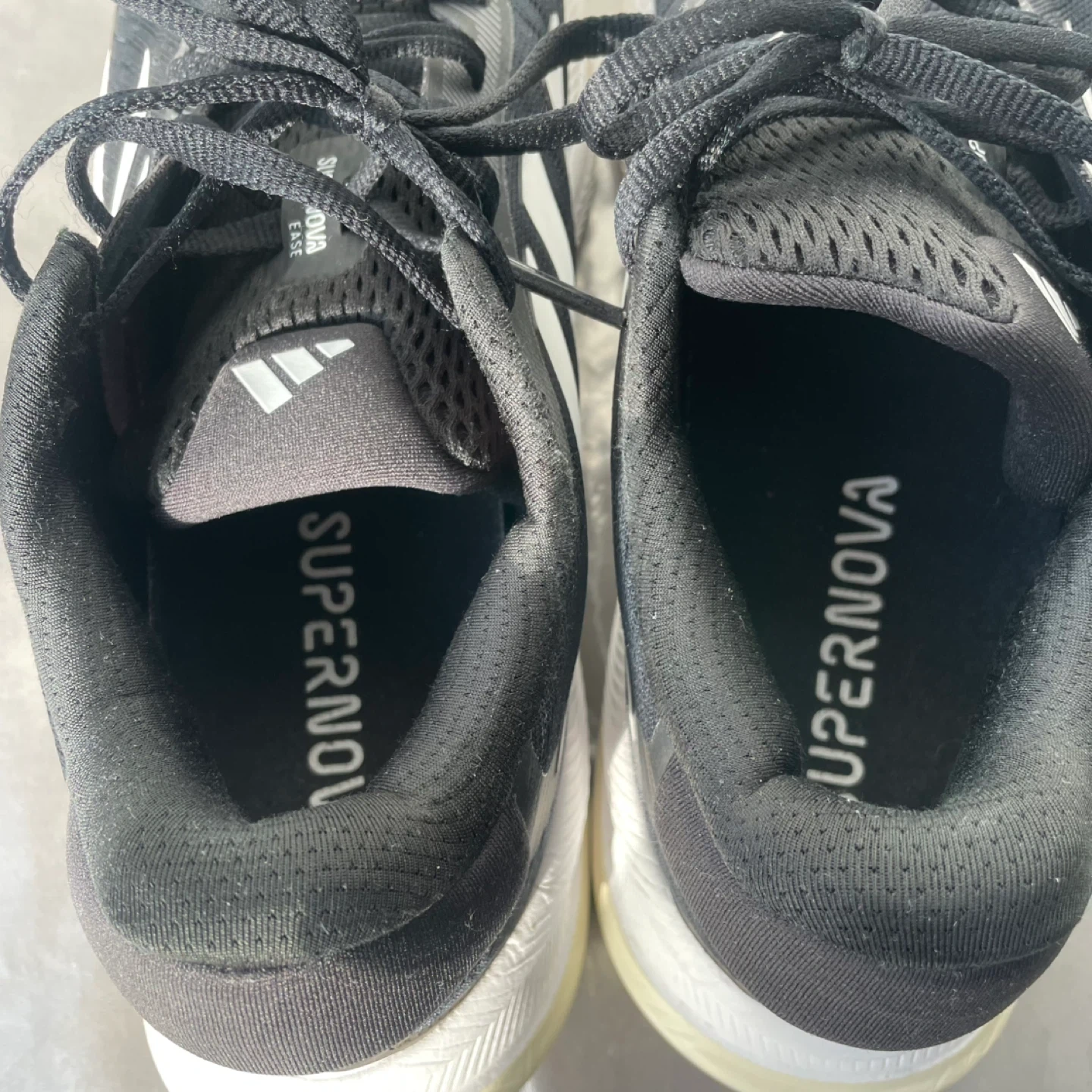 Adidas Supernova running shoes runners sneakers in black and white. They're designed with Dreamstrike technology for comfort.