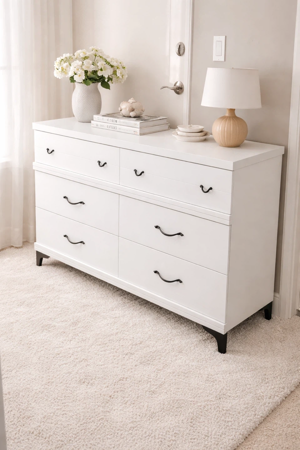 I'm selling a refinished white 6-drawer dresser, perfect for adding a touch of elegance and functionality to any bedroom space. This dresser features a clean, modern design with unique black hardware and it offers ample storage. It is in excellent condition and is fully functional. The drawers are clean and slide well.