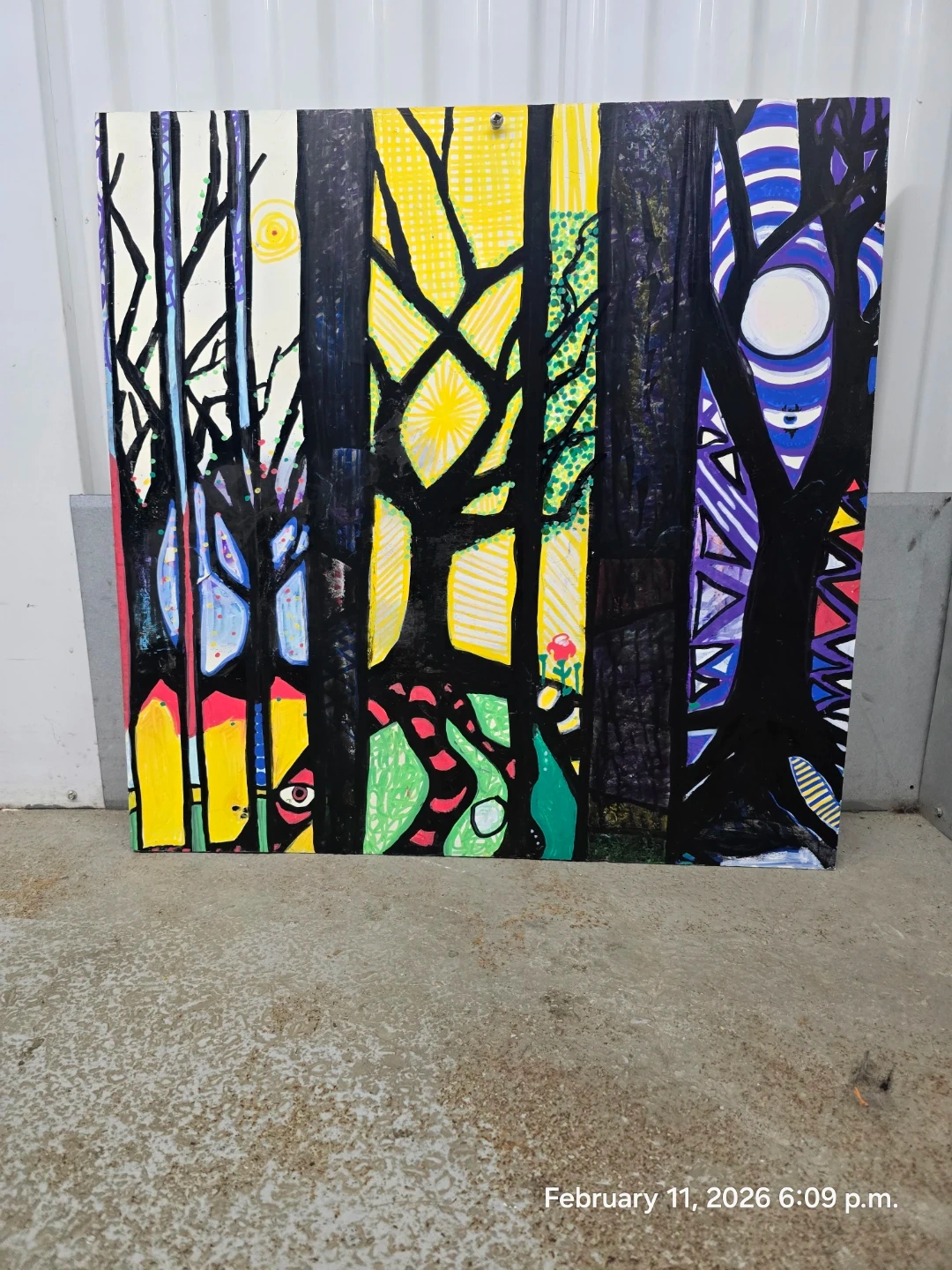This is a unique, handmade painting featuring vibrant tree and forest scenes. It's painted on wood panels with a colourful, artistic style. Ready to add some character to any wall!