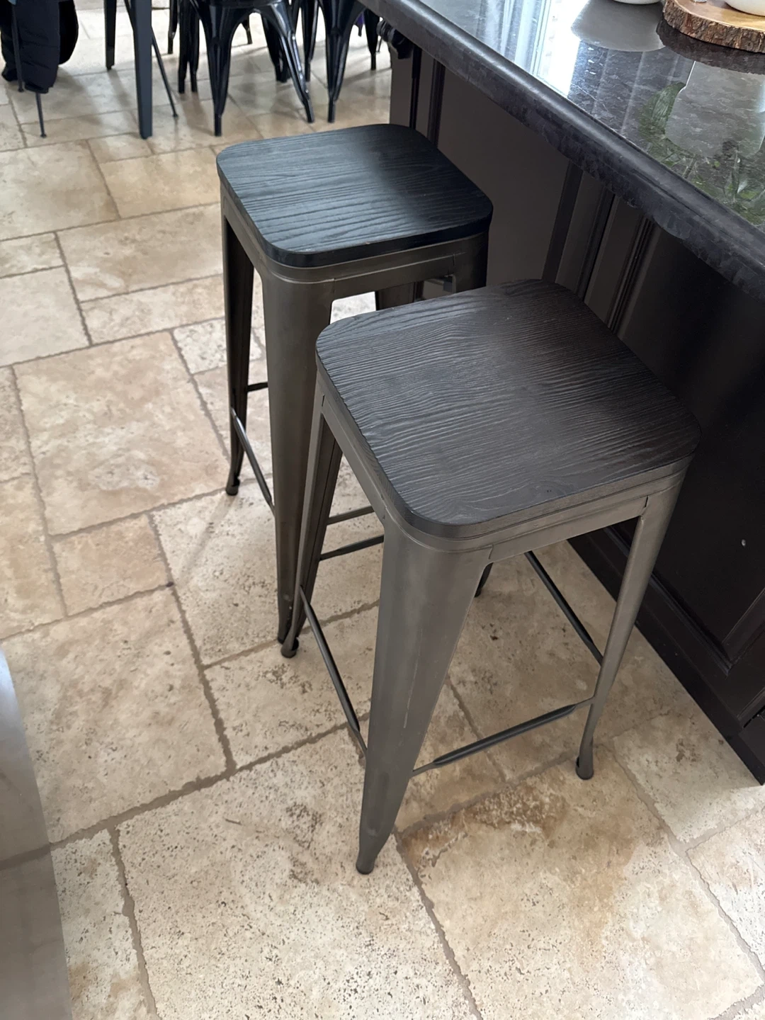 Two metal bar stools with black wood tops. These stools have a durable metal frame and a rustic wood seat. They're great for a kitchen island or home bar setup.