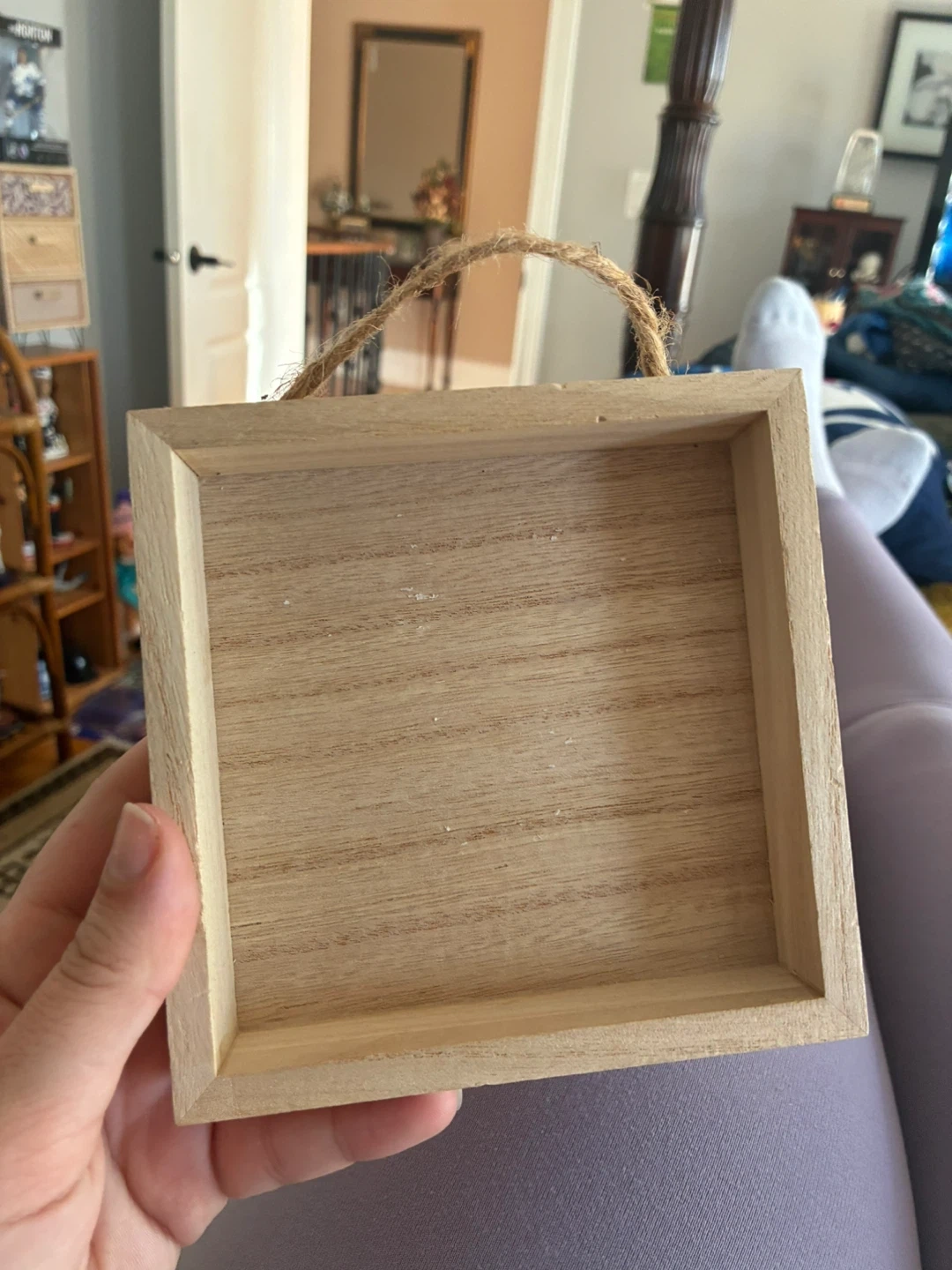 This is a small wooden tray with a jute rope hanger. It's perfect for displaying small decorative items or trinkets. The natural wood finish complements various home decors.
