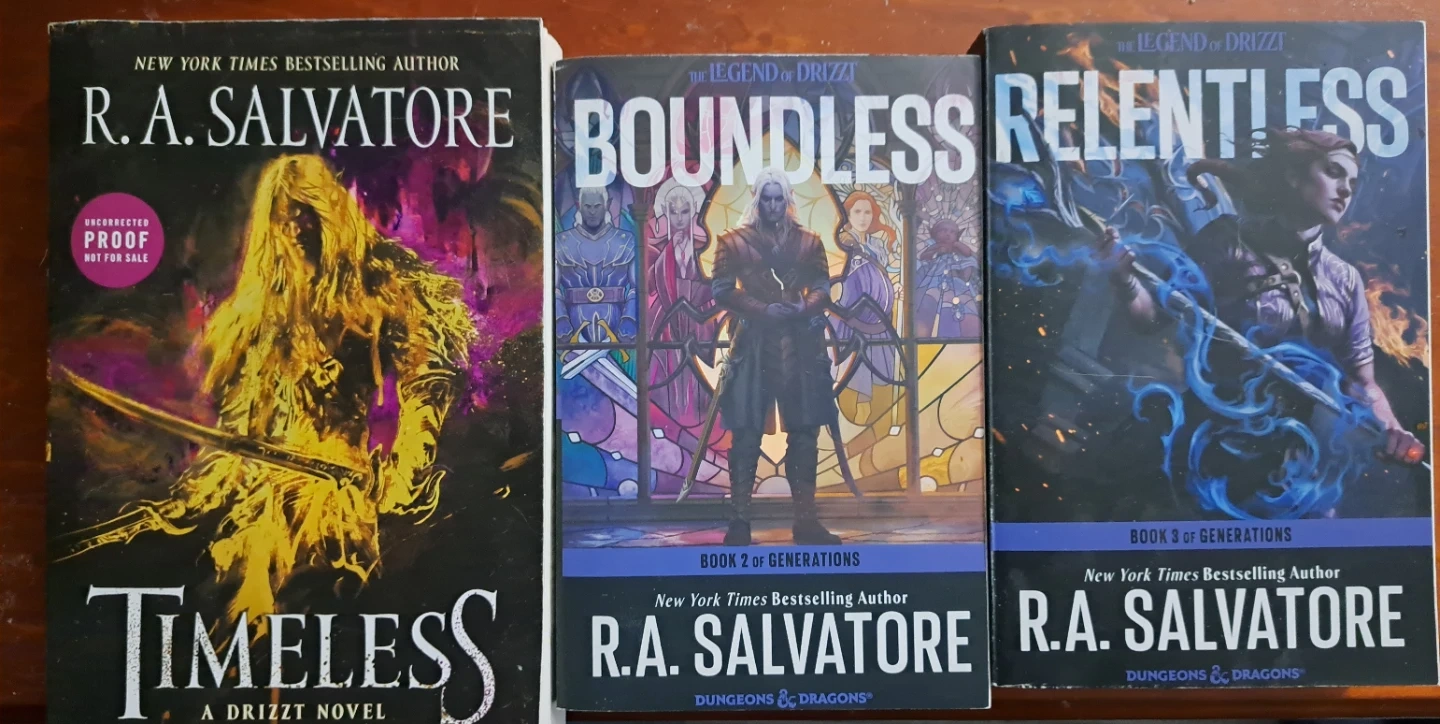 Three R.A. Salvatore Drizzt novels: Timeless, Boundless, and Relentless. These books are part of the 'Books of Generations' series. They're written by a New York Times bestselling author. Perfect for fantasy readers!