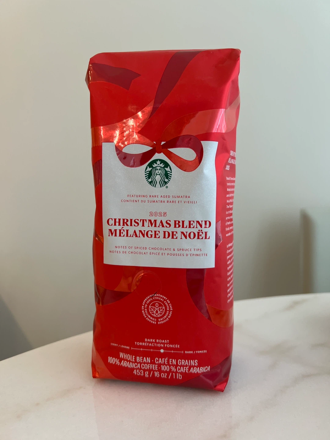 This is the 2025 Starbucks Christmas Blend whole bean coffee.
