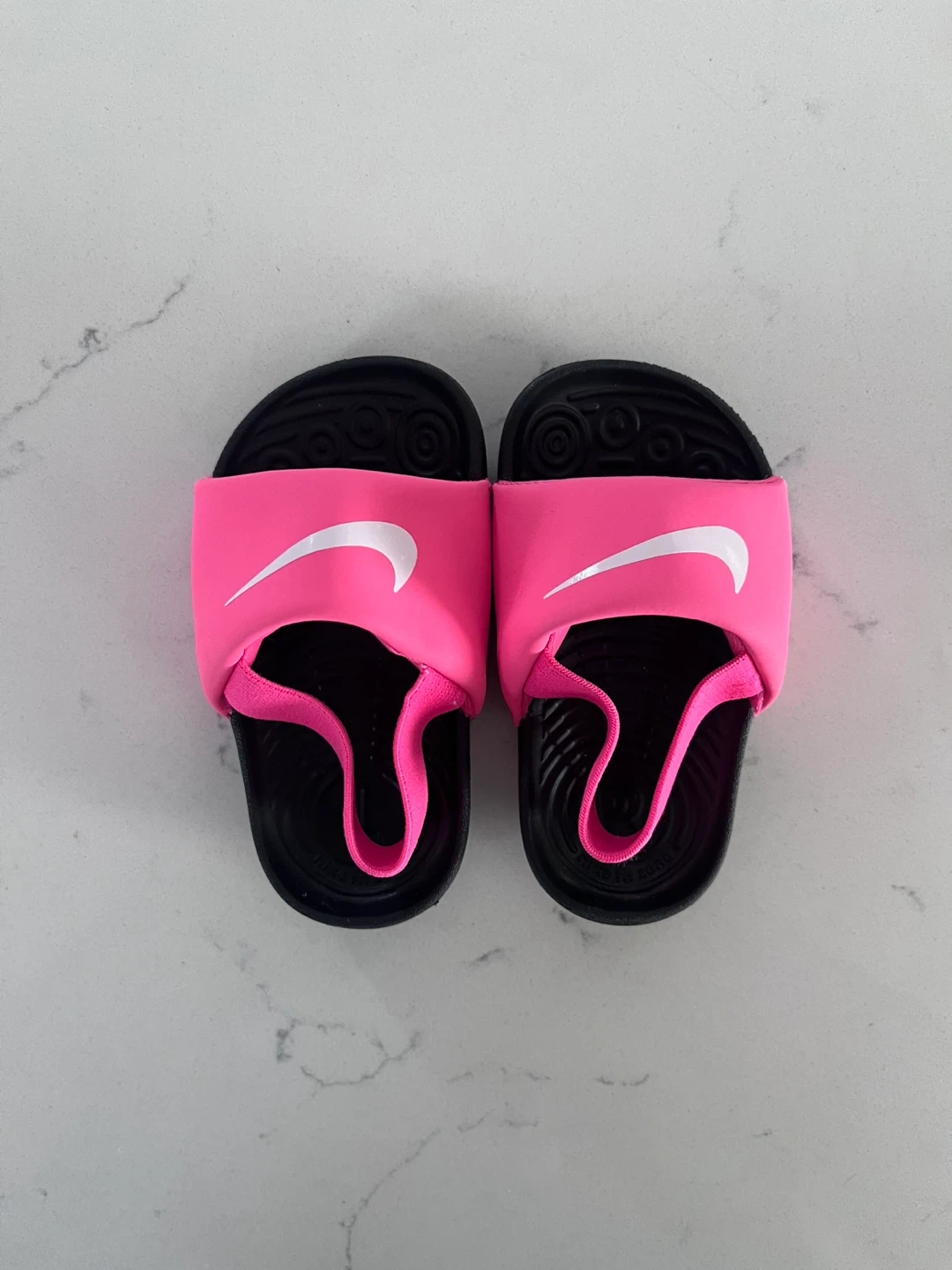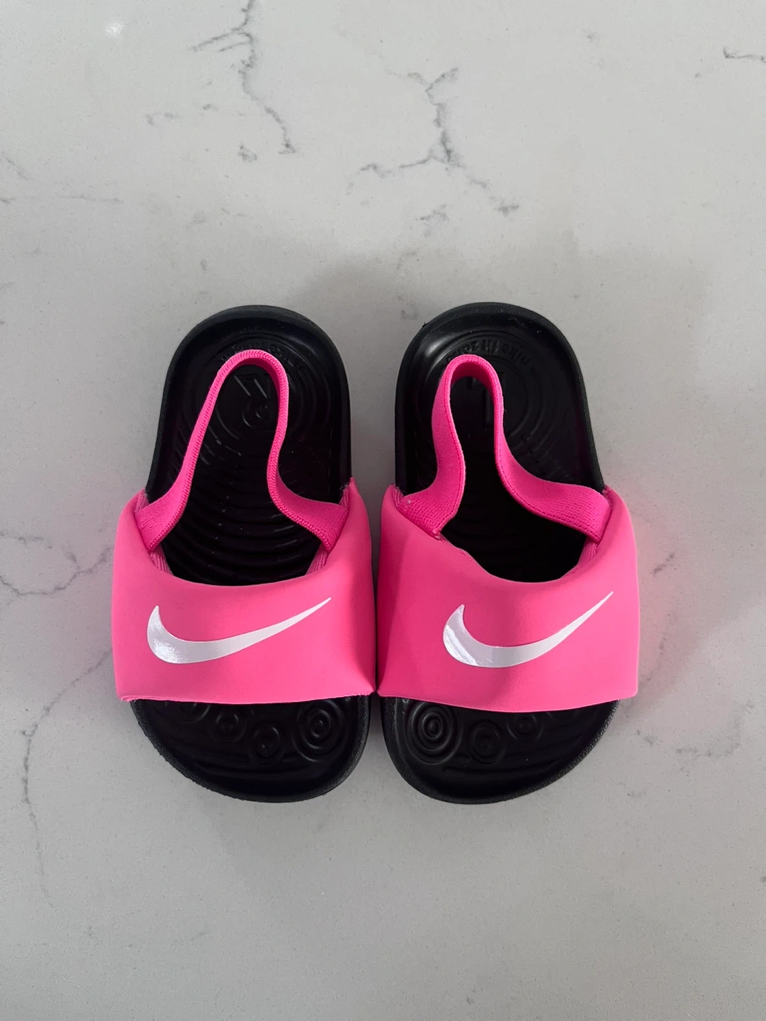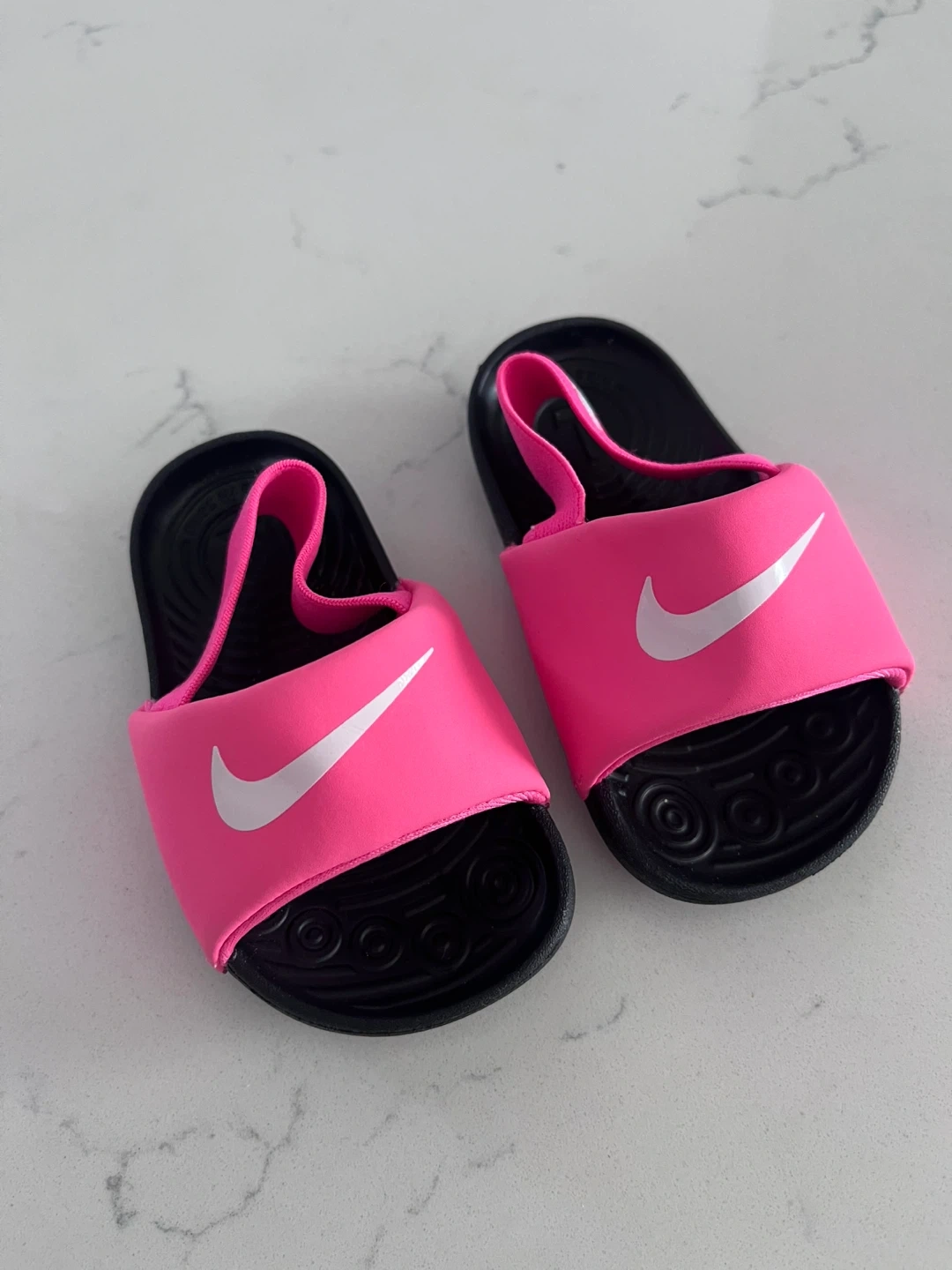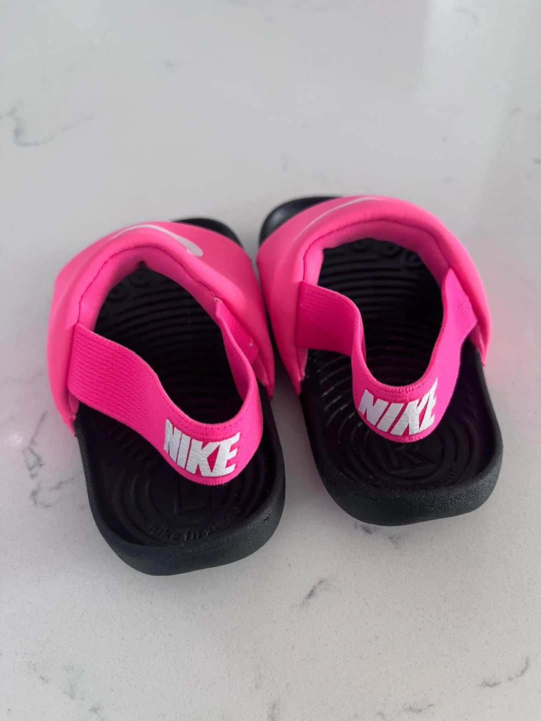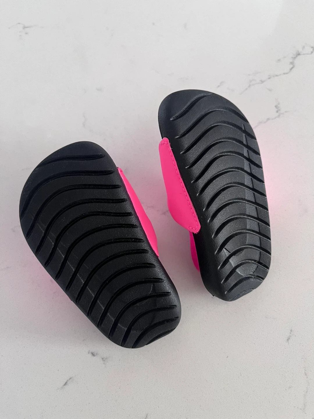 These are new Nike baby slide sandals in a bright pink colour. They feature a comfortable strap and durable sole. Perfect for warm weather and easy to slip on! No box.
