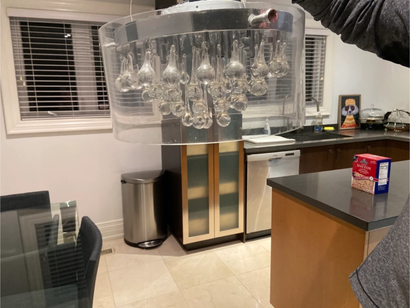 This decorative chandelier features a clear acrylic cylinder and numerous glass droplet accents. It's a stylish light fixture that adds sparkle to any room. Perfect for a dining area or entryway that needs a touch of elegance!