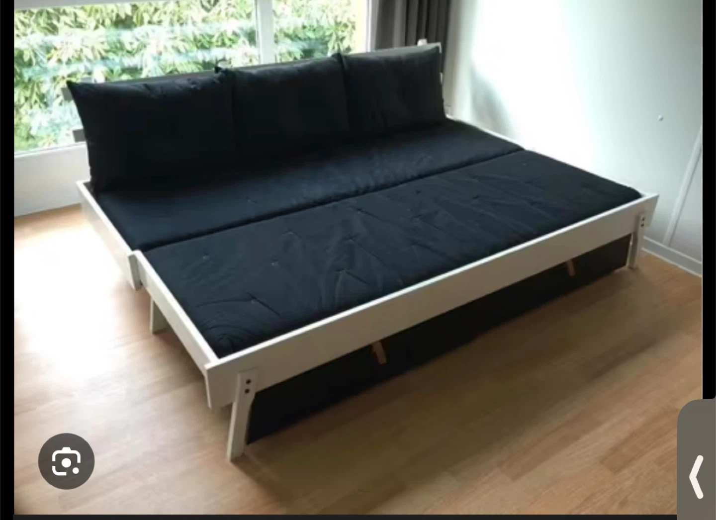 White twin bed frame with a black mattress included. This is a sturdy bed frame that's perfect for a kid's room or guest bedroom. It's made of wood and has a slatted backrest. The mattress is a standard twin size.