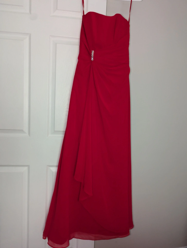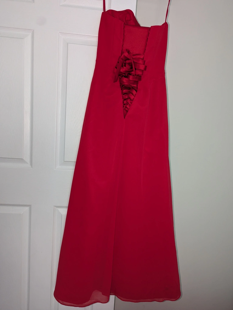 Selling a beautiful red formal dress. It features a strapless design and a corset back. Perfect for a special occasion!
