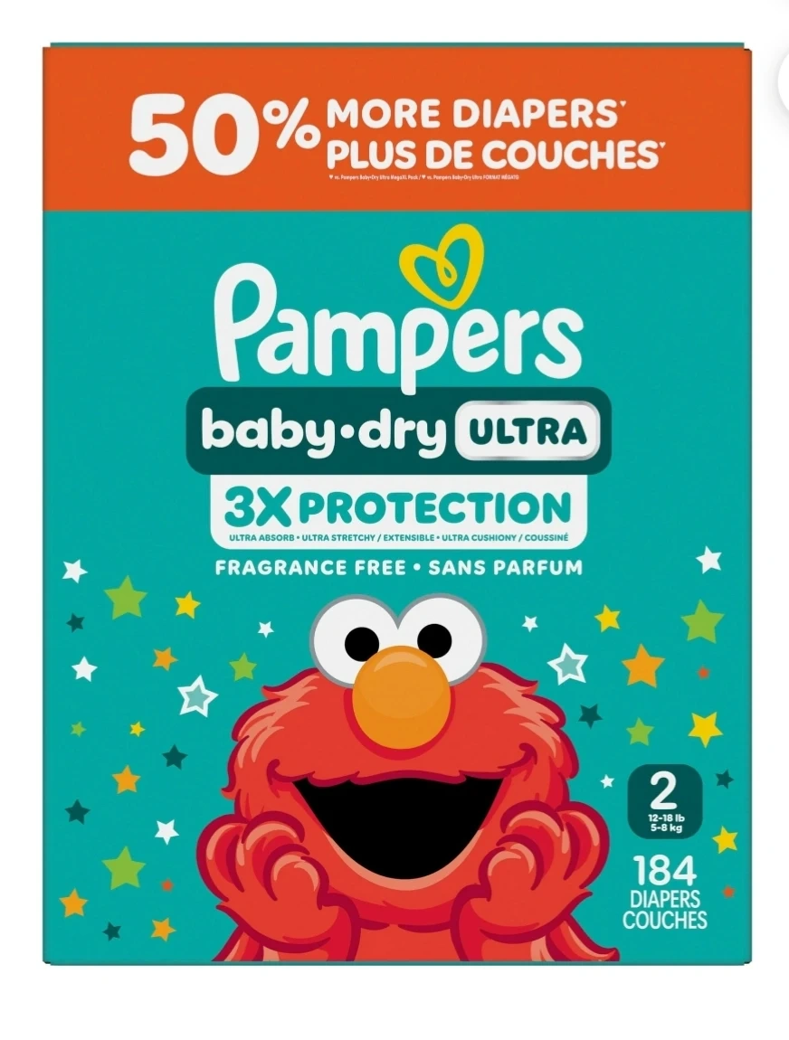 Pampers Baby-Dry Ultra diapers in size 2. These are fragrance-free and offer 3X protection. Comes with 184 diapers per box.