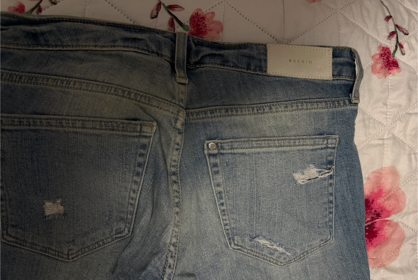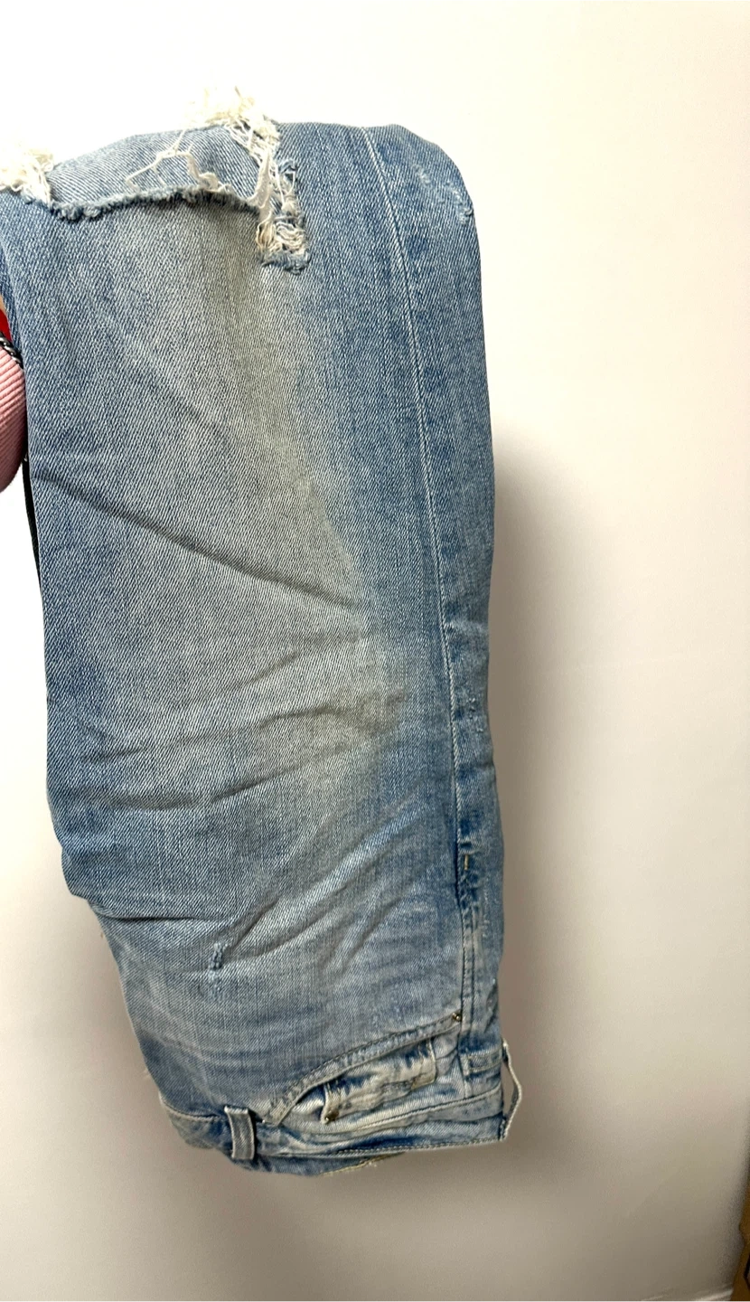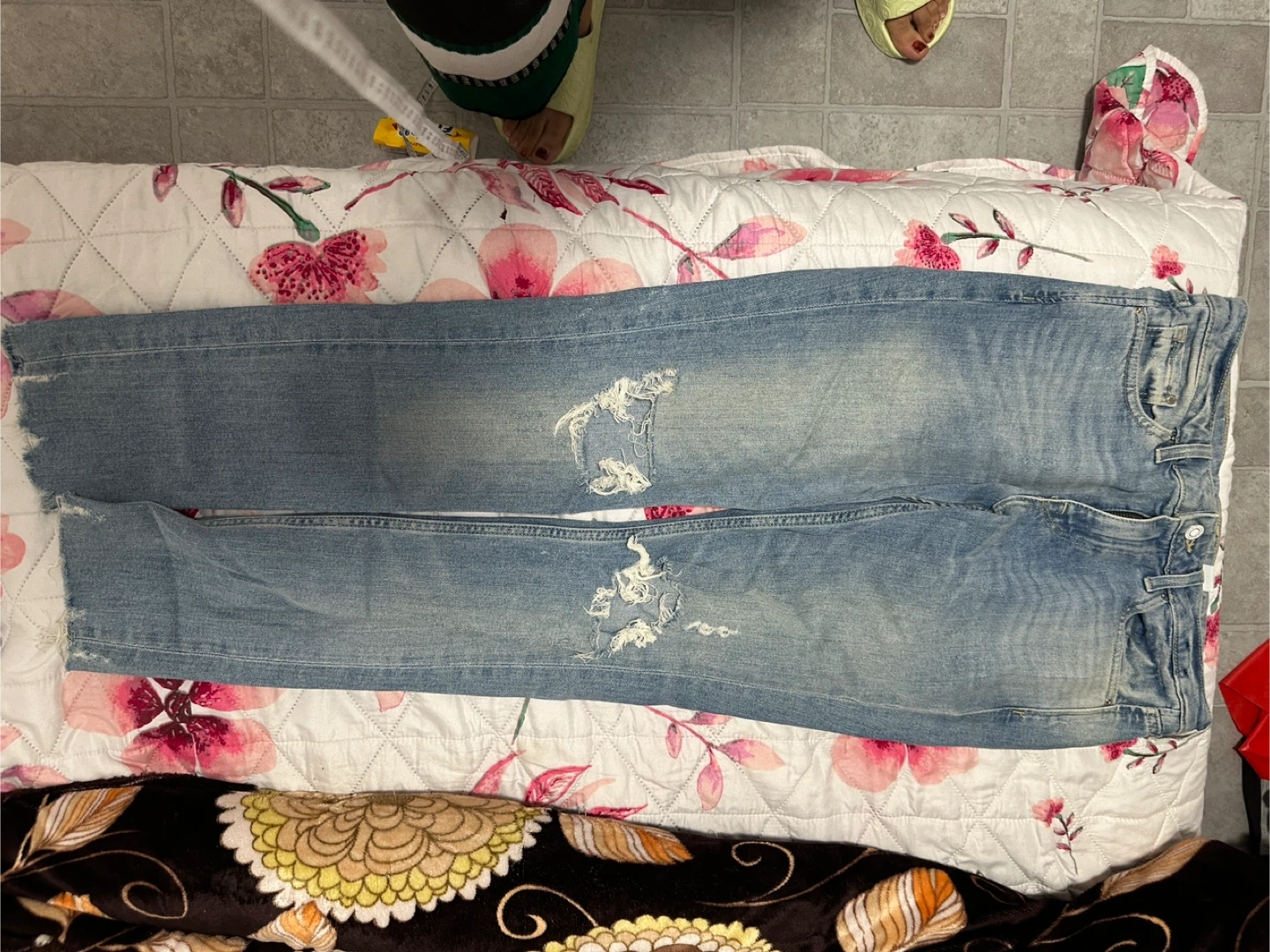Perfect for casual wear! Stylish & Denim jeans. Light wash with cool distressed details, like ripped knees and frayed hems. Waist measures around 31 inches, inseam is about 27 inches.