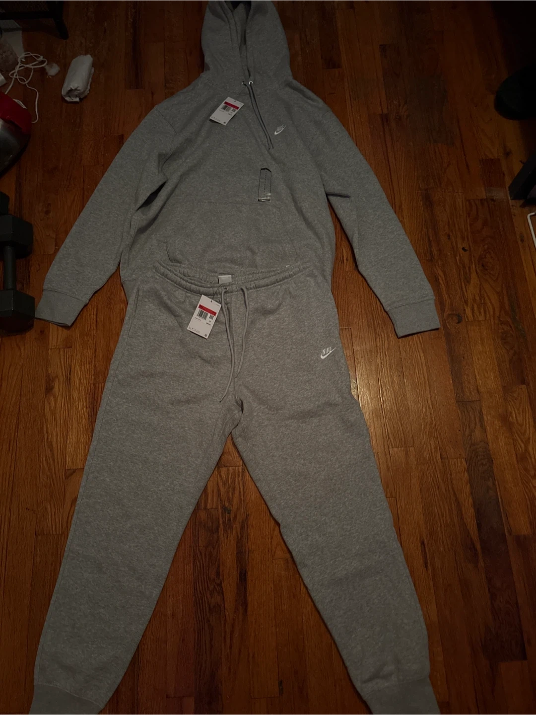 Selling a Nike men's gray sweat suit in size L. The set includes both the hoodie and the sweatpants. NEVER WORN it is brand new.