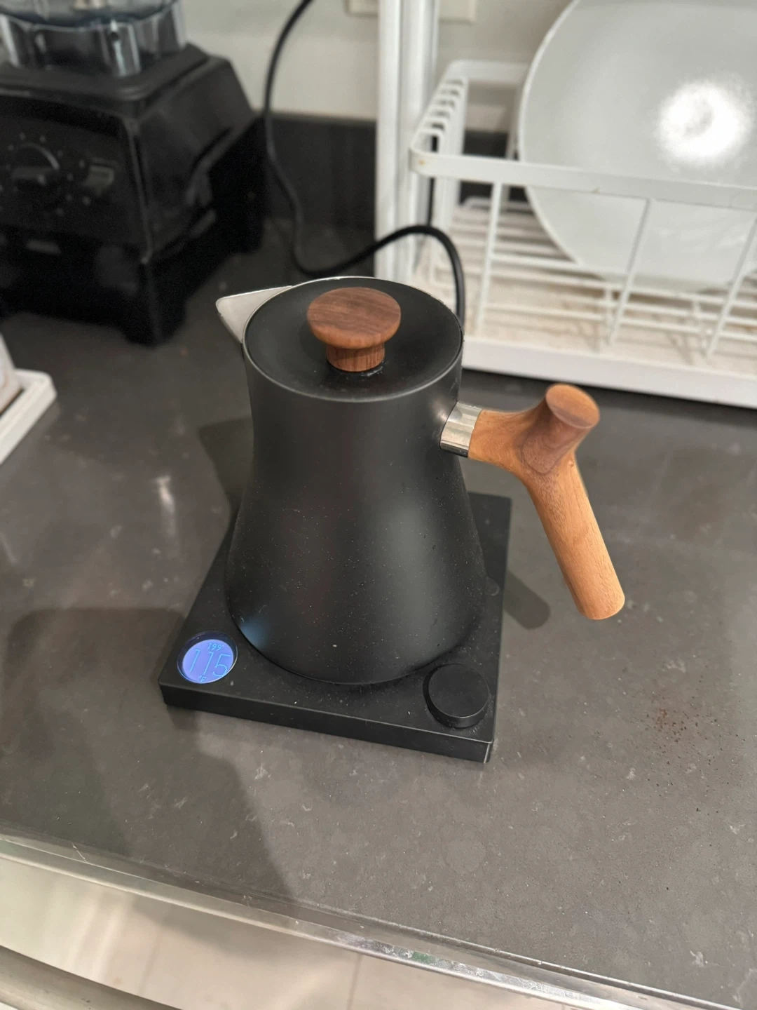 Matte black electric kettle with a wood handle and lid. It's a 0.9L capacity gooseneck kettle. Perfect for pour-over coffee brewing. Features a precision pour spout and a PID controller for temperature accuracy.