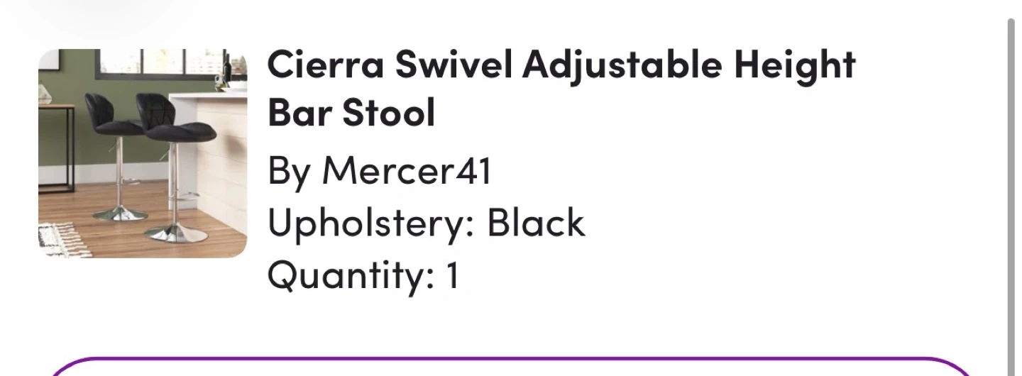 Two Cierra Swivel Adjustable Height Bar Stools by Mercer41. Black upholstery. These stools' height is adjustable. They're built with a metal base for stability.
