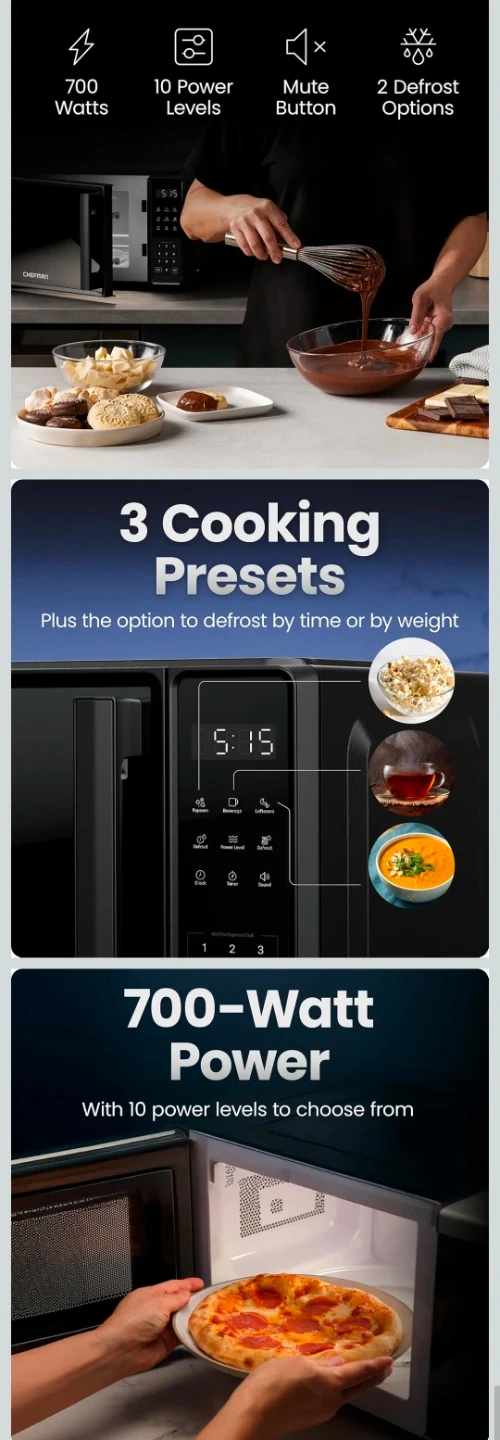 700 Watts β’ 10 Power Levels β’ 6 Cooking Presets