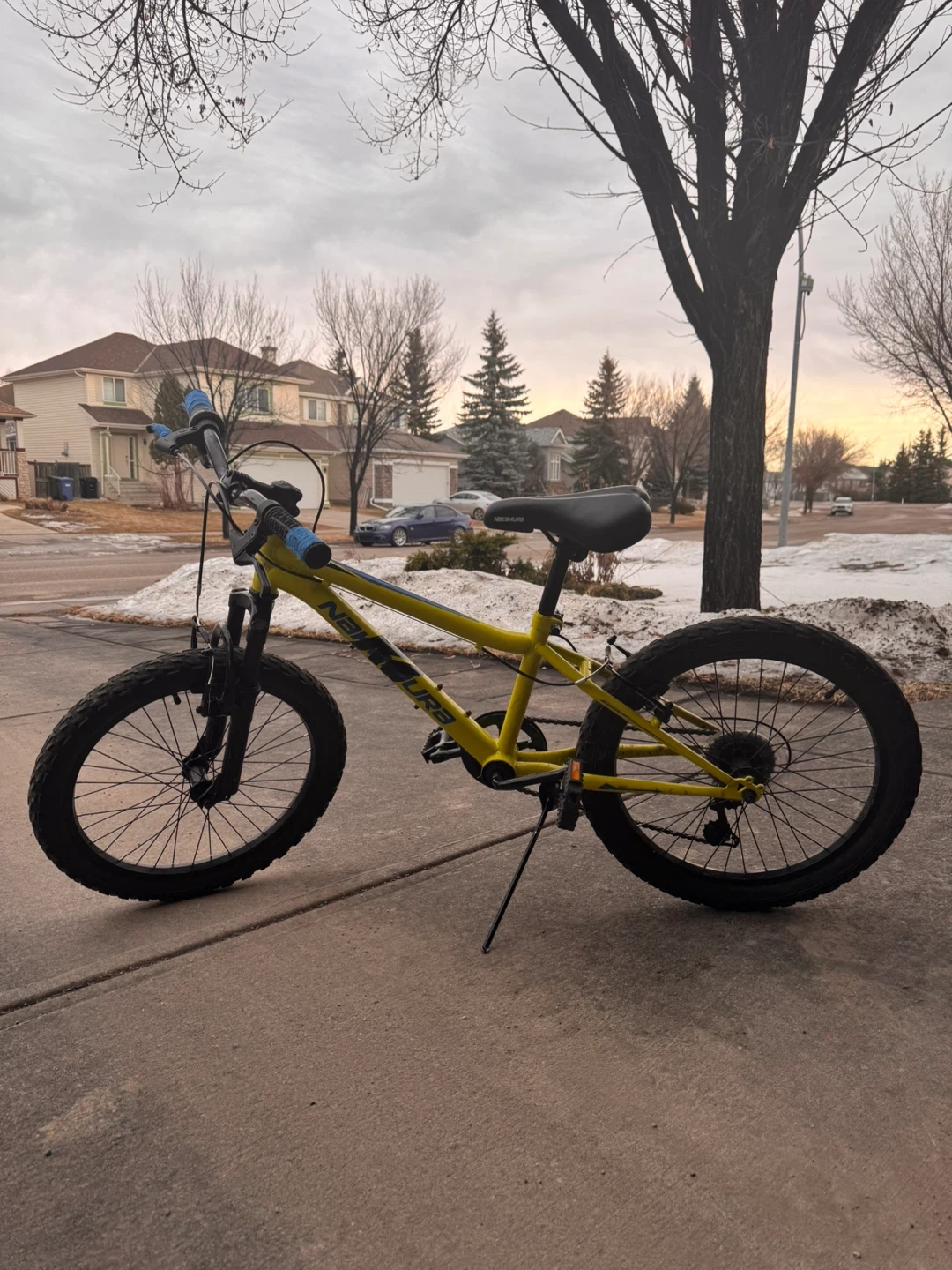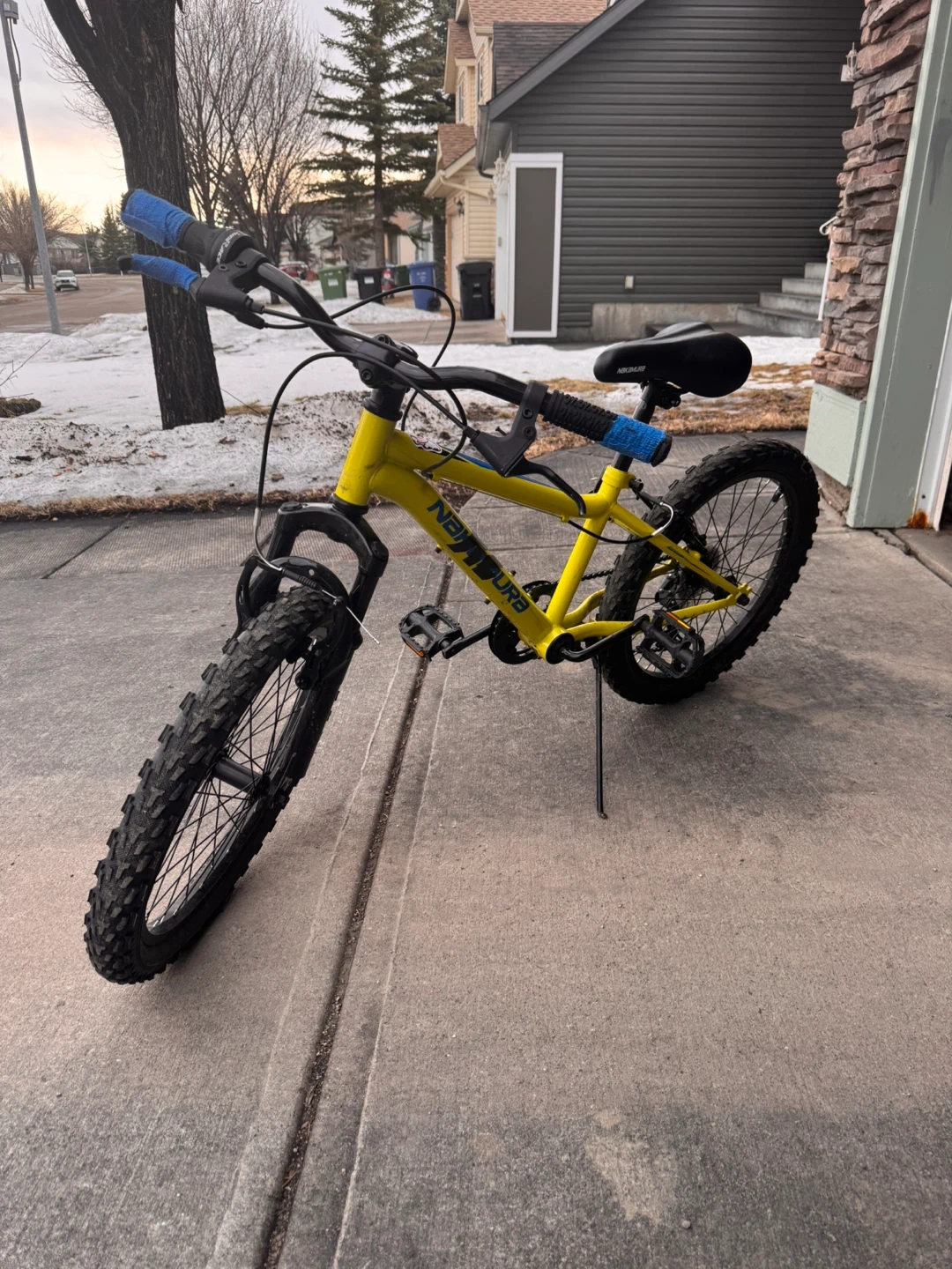 This is a yellow-green bike with handlebar grips and a black seat. It has front suspension and hand brakes.Tires in good condition.No damages.Comes with bike bell as well.It is perfect for young riders to hit the trails or the neighbourhood streets!