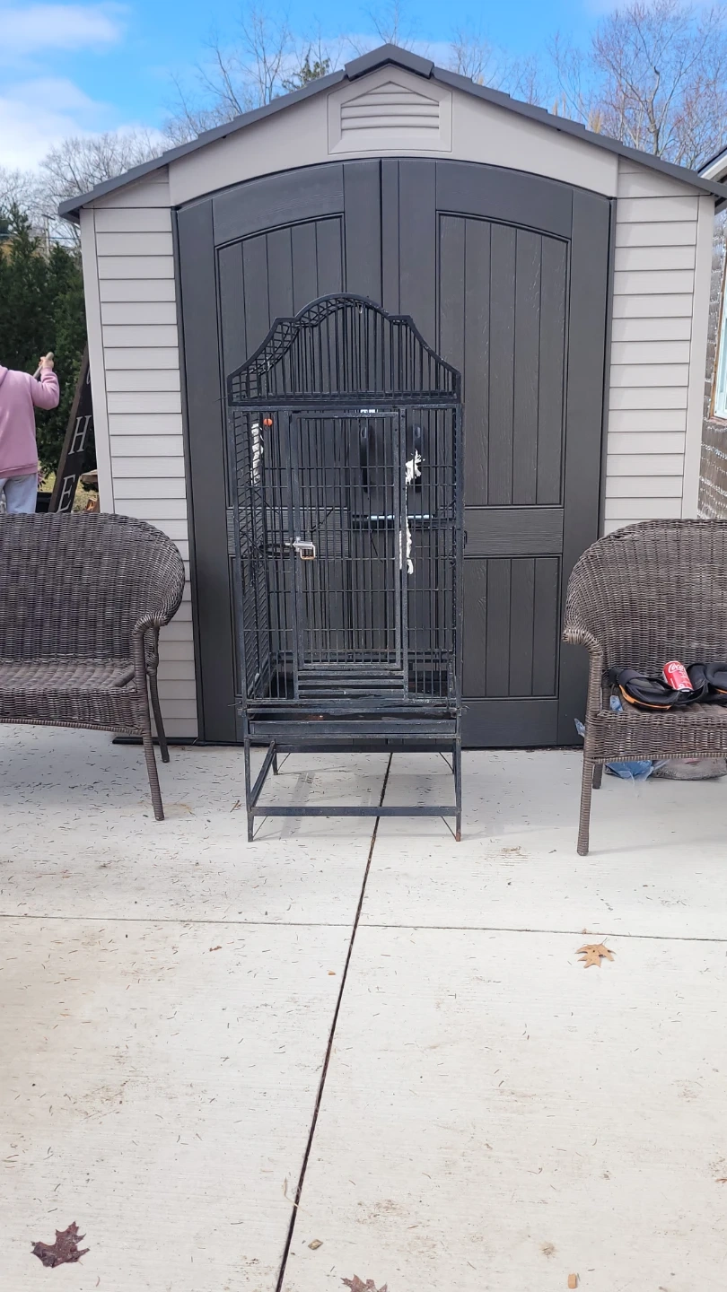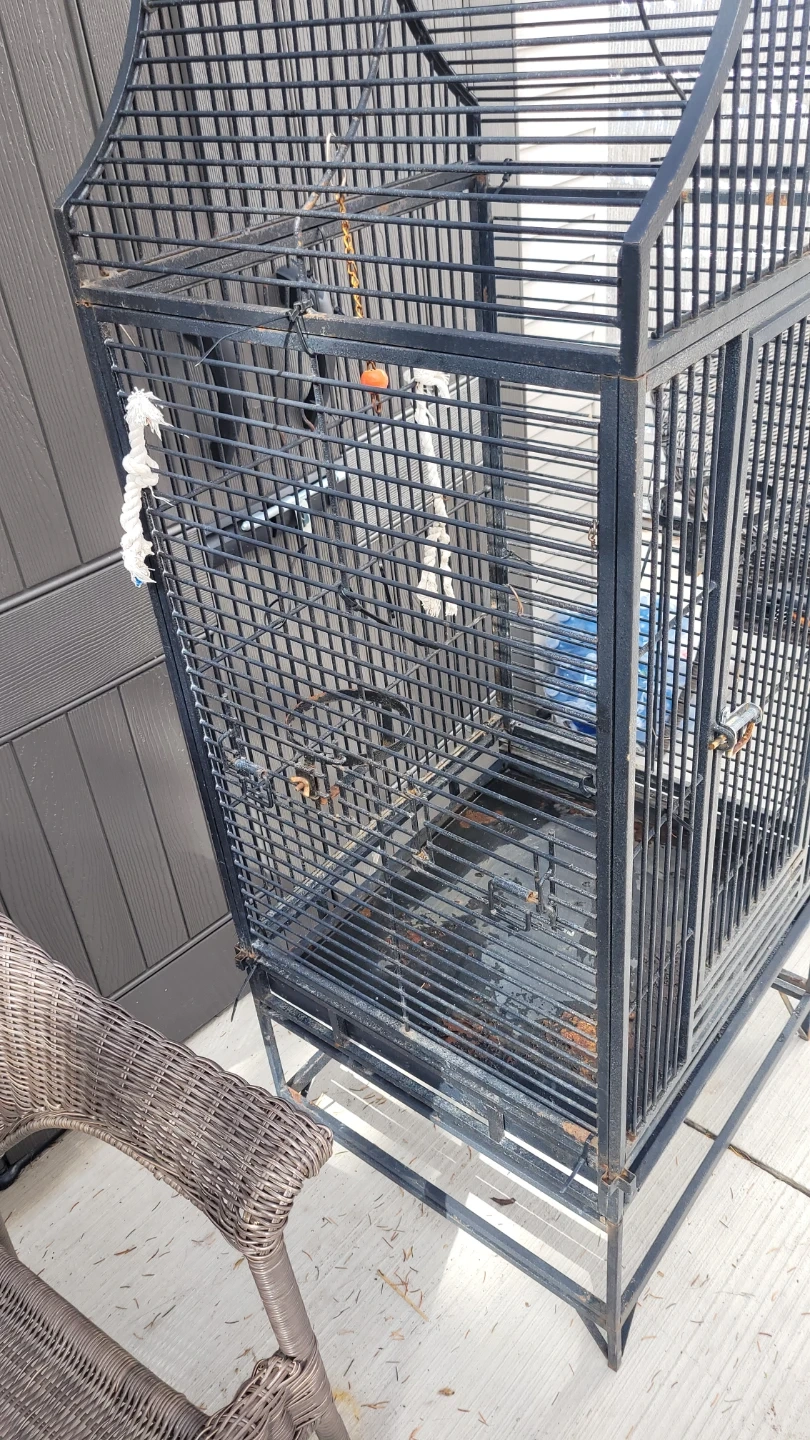 This is a large black bird cage with a pull-out tray for easy cleaning. It features a sturdy metal construction and a wire grate. Includes perches and a water dish. Could use a new coat of paint.