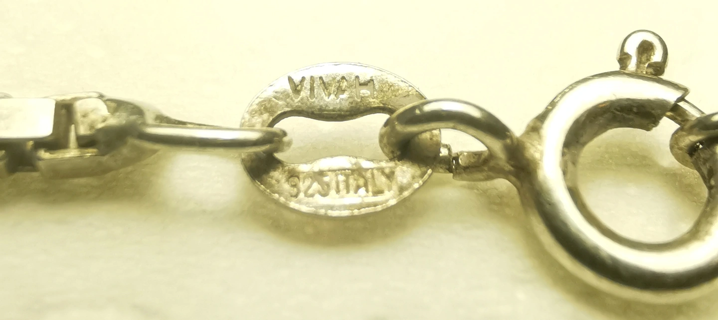 Good Vintage Condition light wear. The pendant features deep, crisp hallmarks that are not worn down. The silver retains a beautiful luster with a light, authentic patina that makes the 1977 stamps stand out. No significant scratches, dents, or deep gouges. The Italian-made box chain is fluid and the spring clasp is tight and secure.