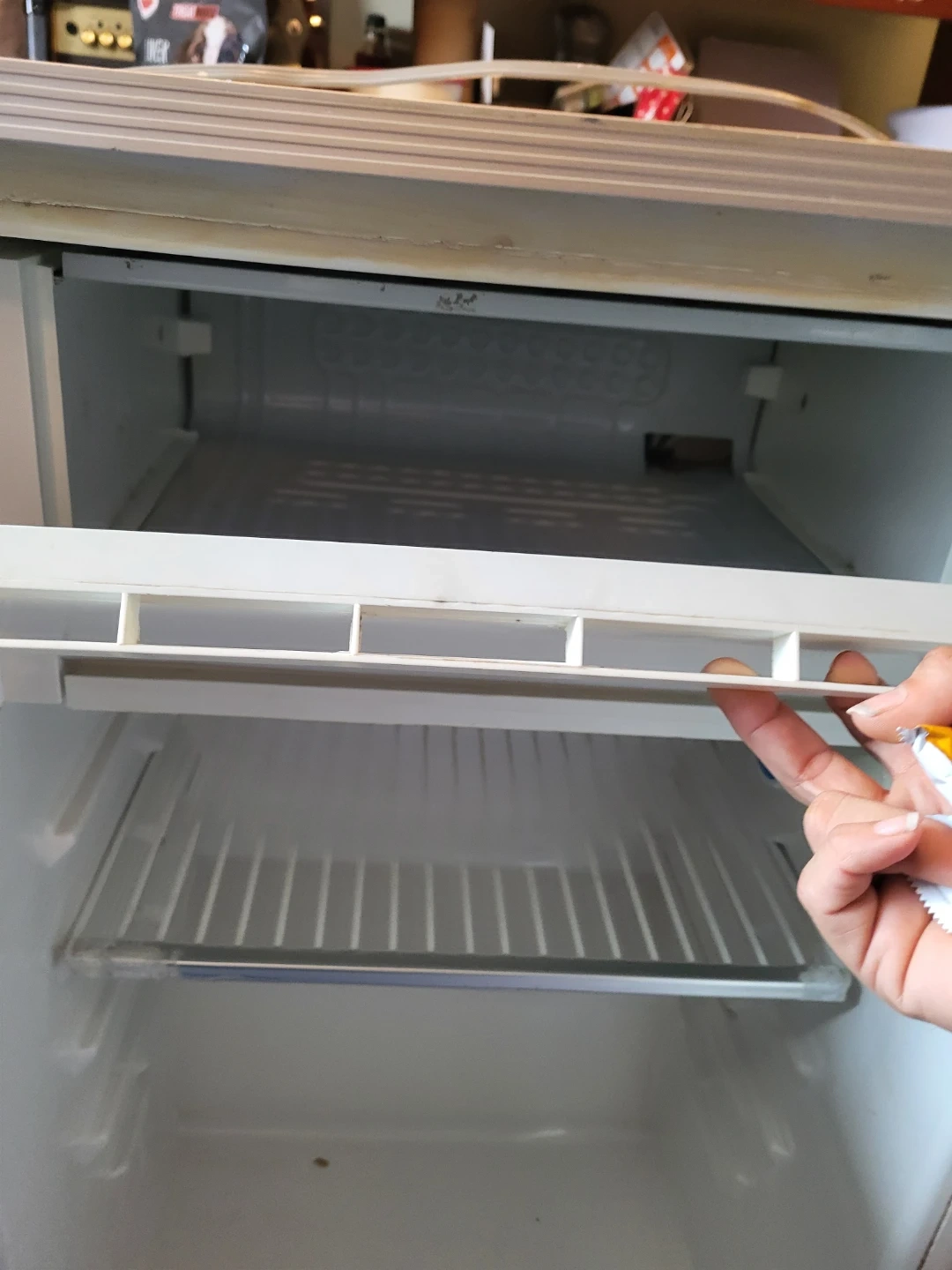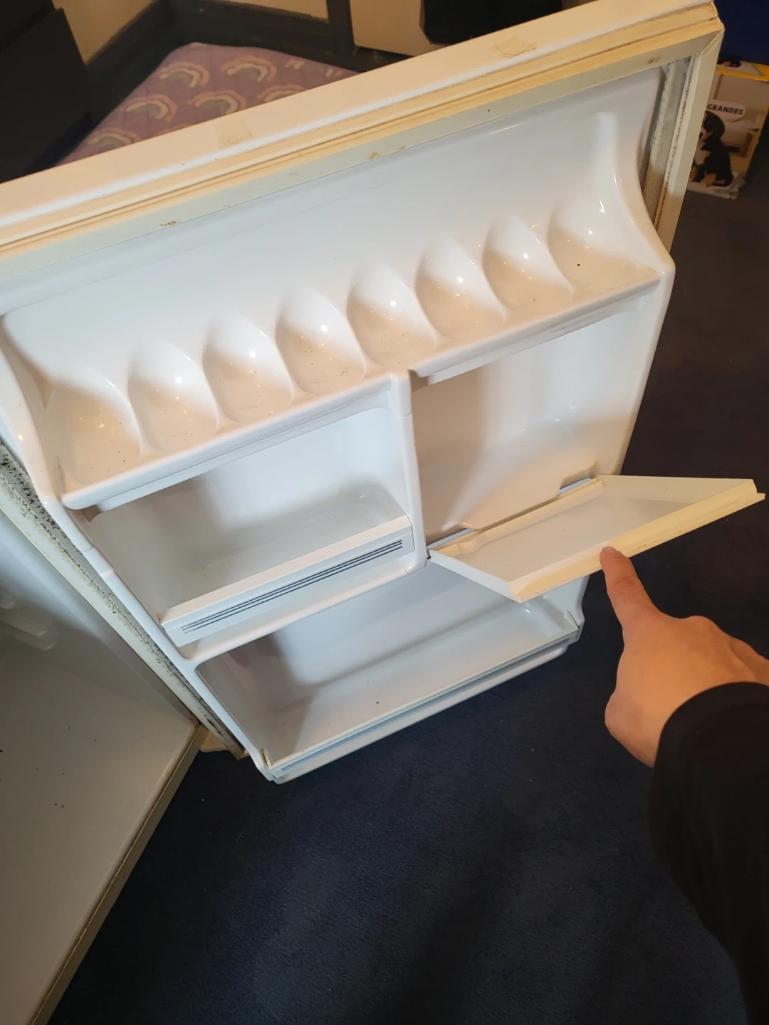 This is a white mini fridge. It's a compact size, perfect for a garage or small space. The interior has adjustable shelves and door compartments. Works great although very load.