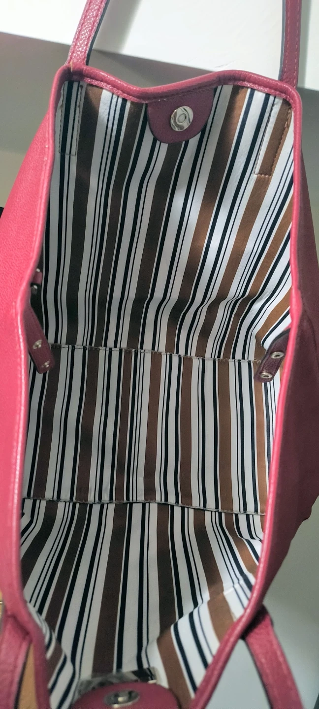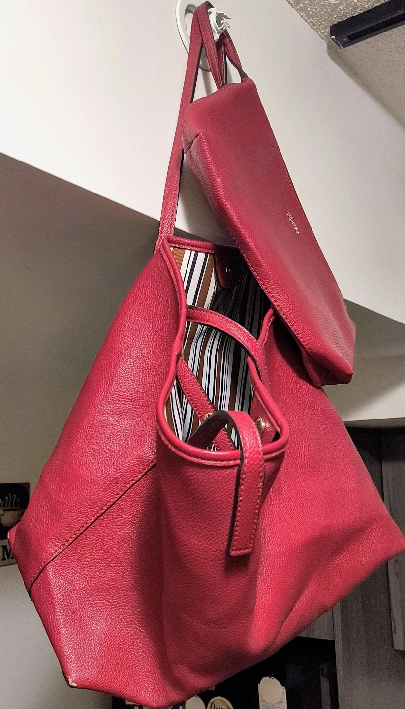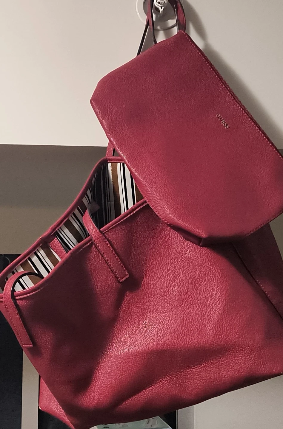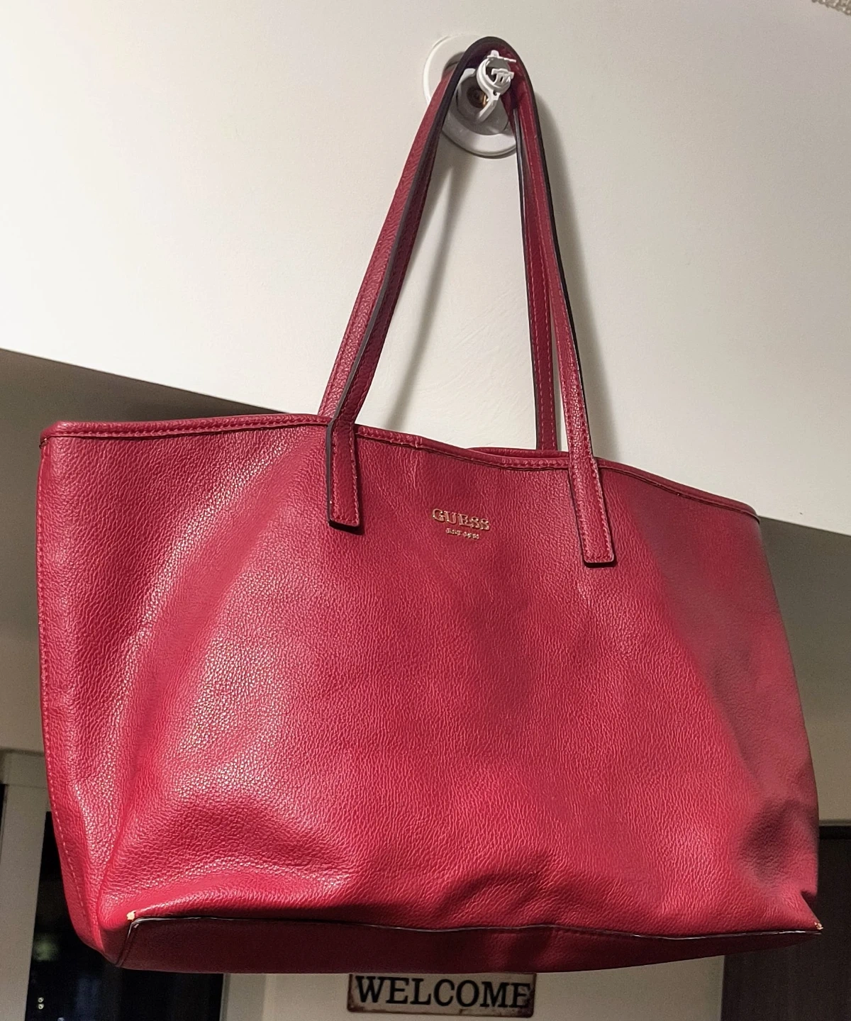 This is a Red Guess Deep Tote Bag. It is vegan leather, has a striped lining and comes with a matching smaller pouch (perfect for makeup/accessories). Great for everyday use!