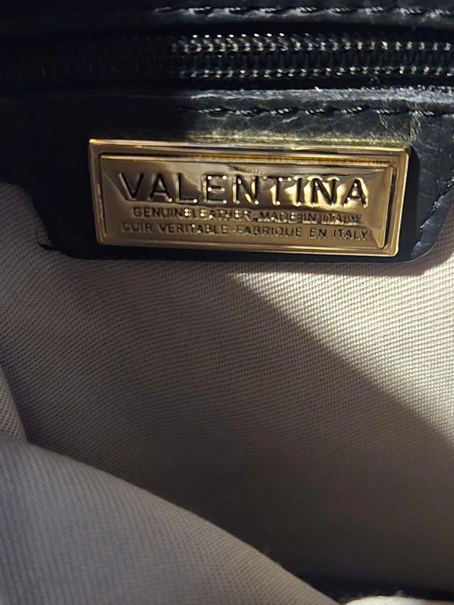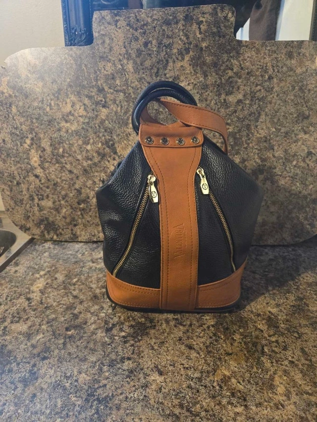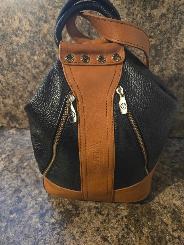 Stylish Valentina bag made from genuine Italian leather in black and tan. This versatile bag can be converted from a bucket bag to a backpack. Features gold-tone hardware with V logo details on the zippers and adjustable straps. Condition: Used - Good. Cash accepted.