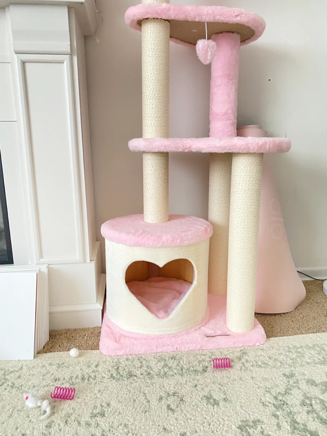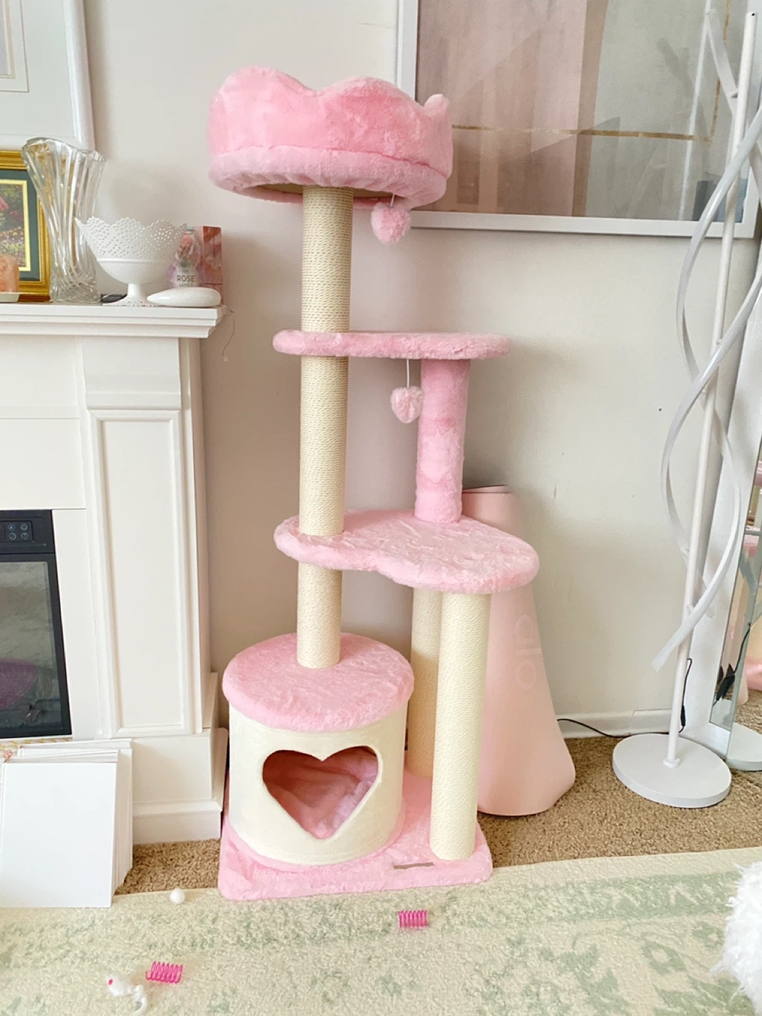This multi-level cat tree features scratching posts covered in sisal rope. It has a cozy hideaway condo with a heart-shaped entrance and several platforms for lounging. The plush pink covering is soft and inviting for cats.