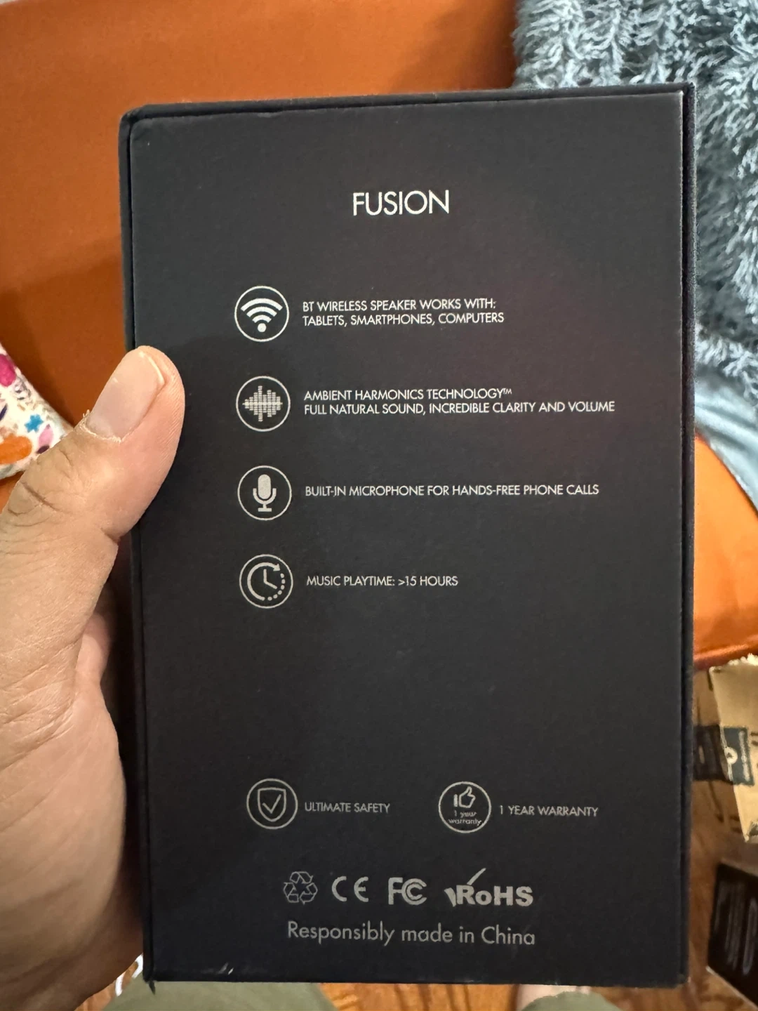 Fusion BT wireless speaker with ambient harmonics technology. It has a built-in microphone for hands-free calls and over 15 hours of music playtime. This speaker works with tablets, smartphones, and computers.
