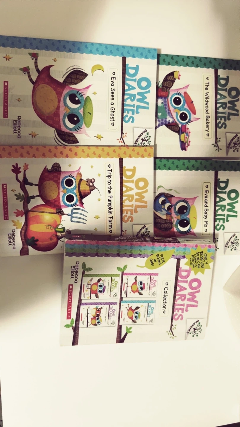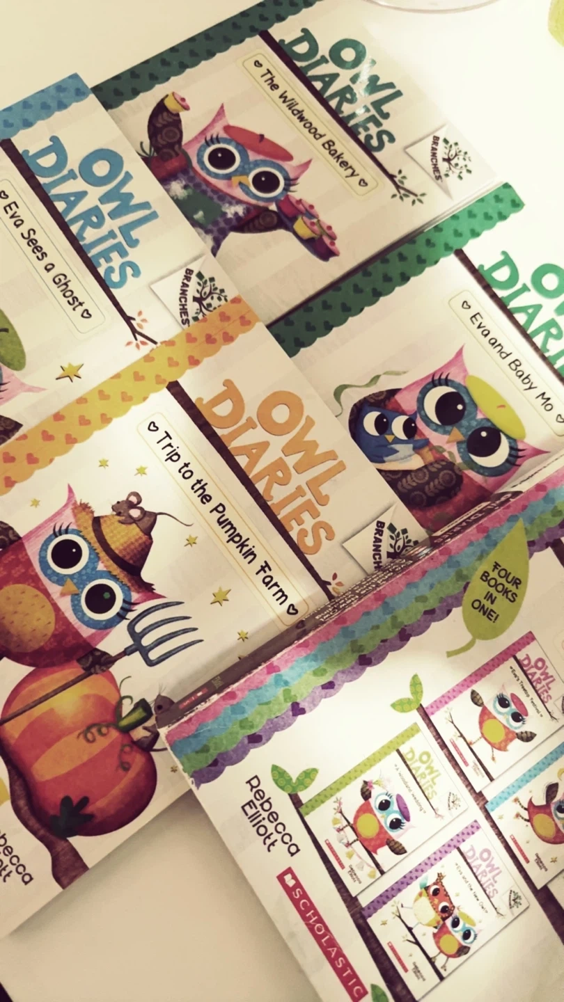 This is a collection of Owl Diaries books by Rebecca Elliott. It includes individual titles like "The Wildwood Bakery," "Eva Sees a Ghost," "Trip to the Pumpkin Farm," and "Eva and Baby Mo." These books are part of the Branches series. A book set with four books is also shown.