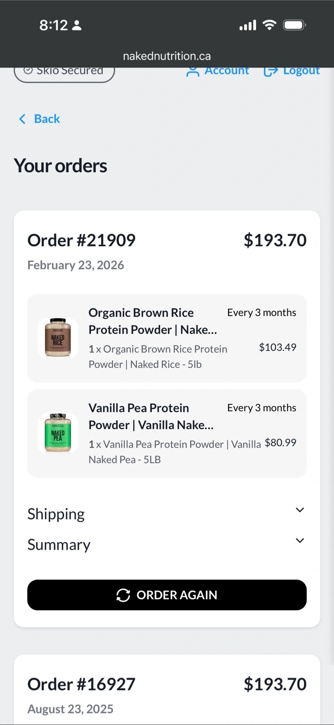 Selling one 5lb container of Naked Nutrition Organic Brown Rice Protein Powder and one 5lb container of Naked Nutrition Vanilla Pea Protein Powder. Both are unflavoured. The order date was February 23, 2026. These powders are great for post-workout recovery. I accidentally received this item before I could cancel the subscription. No longer needed. The product is sealed and still in original packaging.
