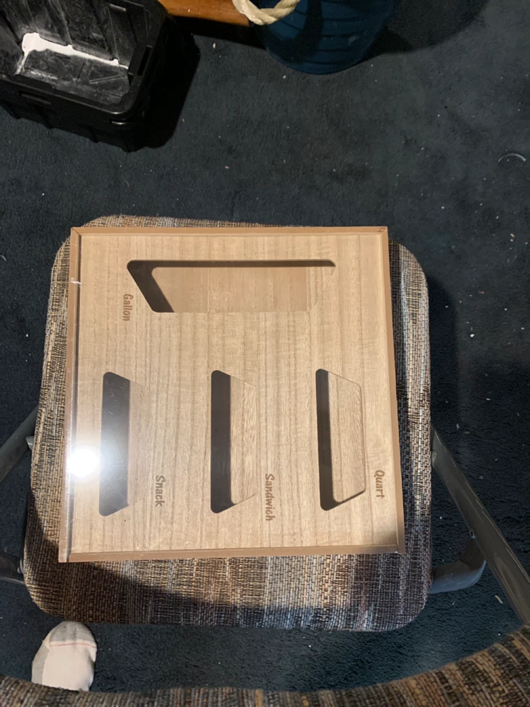 Wooden organizer for storing various sizes of food storage bags. It has slots for gallon, sandwich, quart, and snack sizes. Keep your bag drawer tidy!