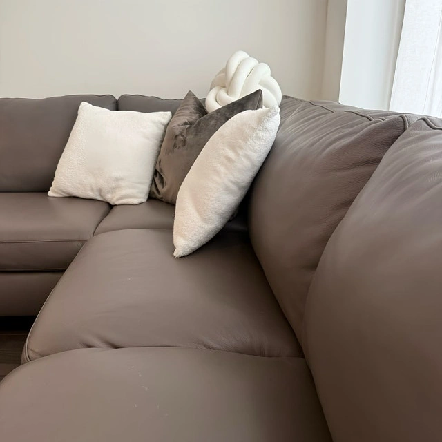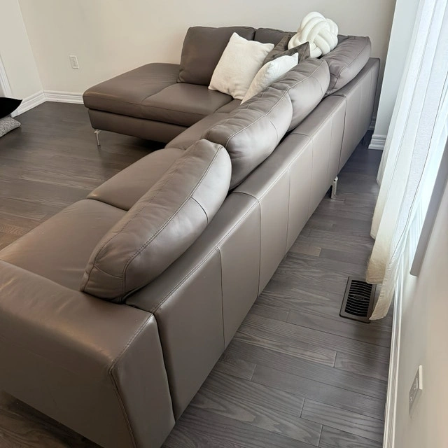 Beautiful Natuzzi Editions genuine leather sectional. Originally paid $4,000. In 9/10 condition — very well maintained. Modern taupe/grey tone with sleek metal legs. Clean lines, low profile, and extremely comfortable. Approx. Dimensions: • 114” length • 35” depth • 83” chaise • 30” height. The chaise is long and perfect for fully stretching out. No rips, no sagging, no damage. From a smoke-free home. High-end Italian brand quality at a fraction of retail. Located in Aurora.
