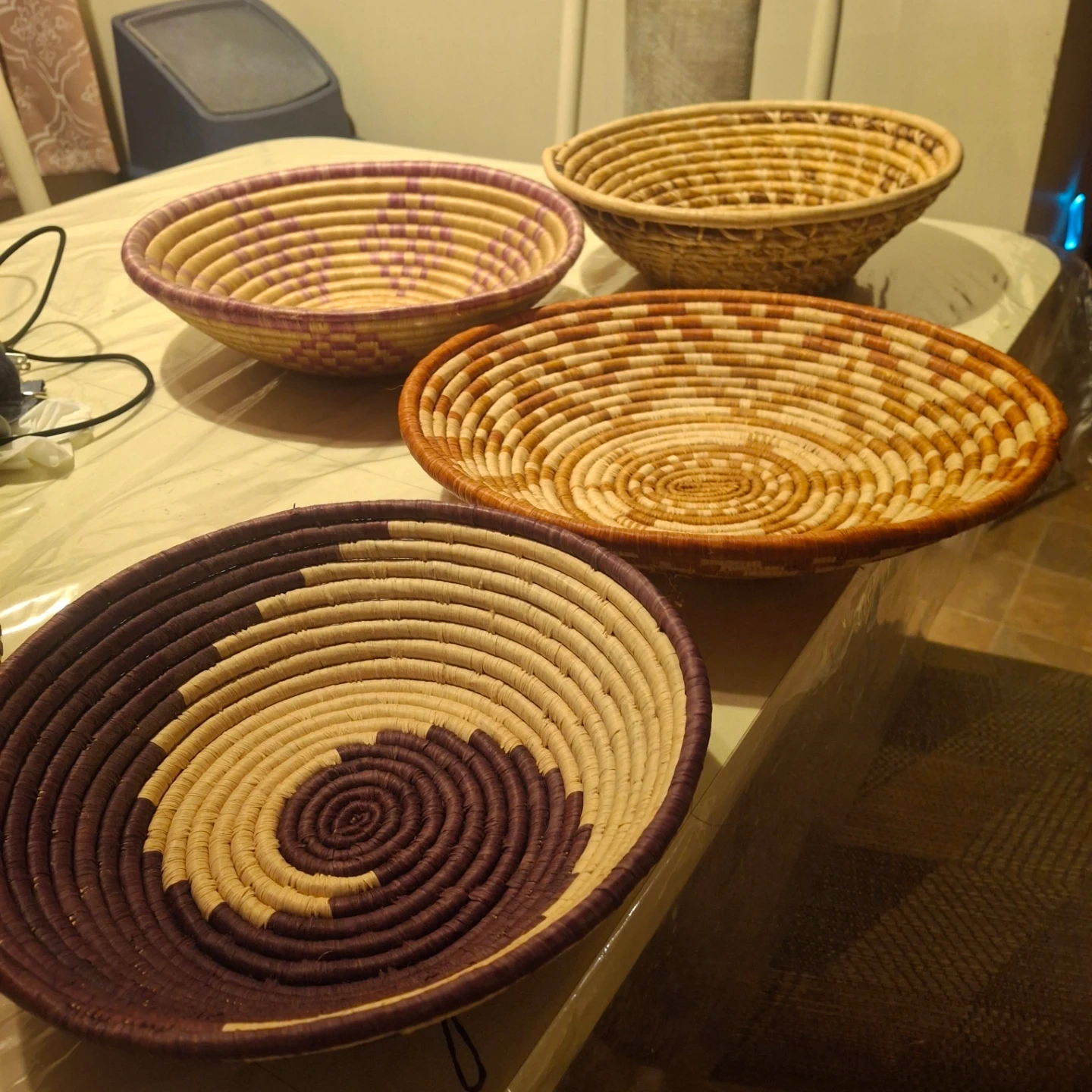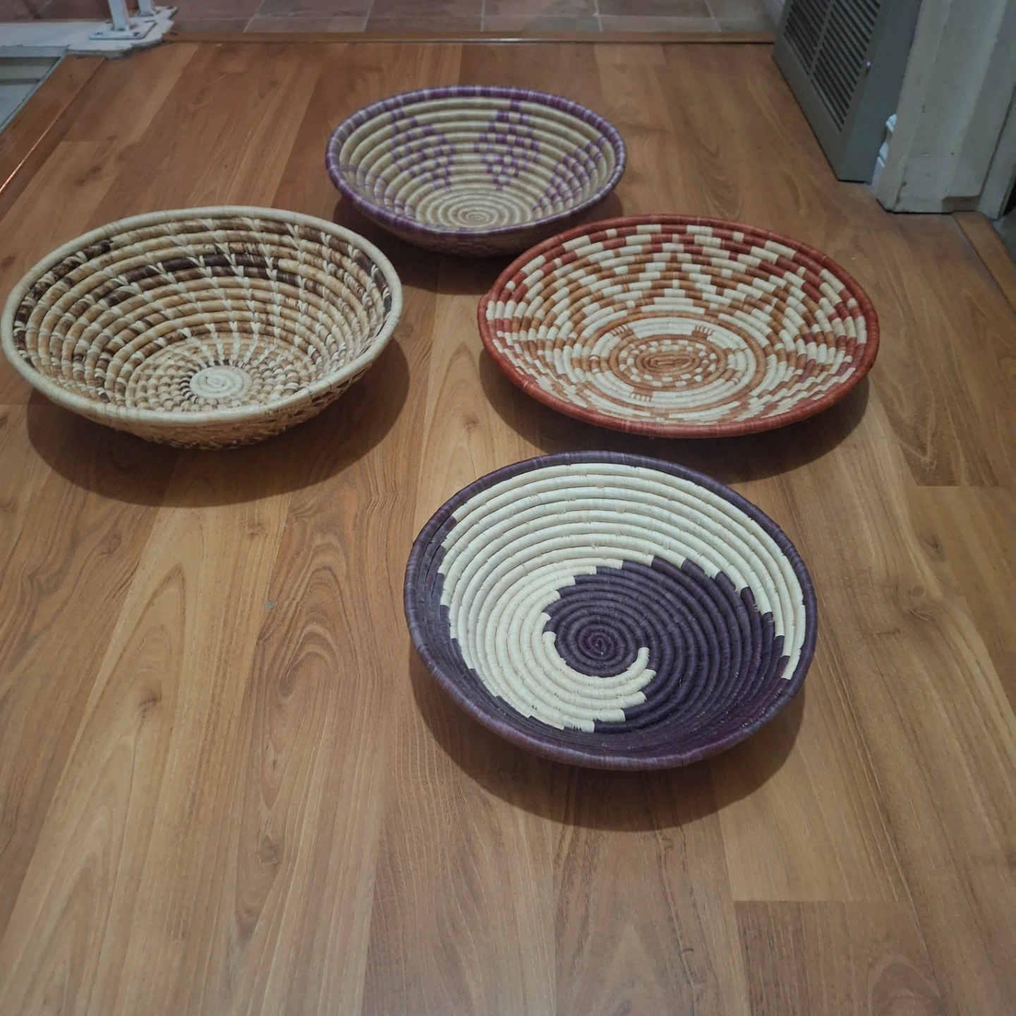 A set of four decorative woven baskets. Each basket features a unique pattern and colour combination. They're great for organizing small items or as unique wall decor! Made in zimbabwe