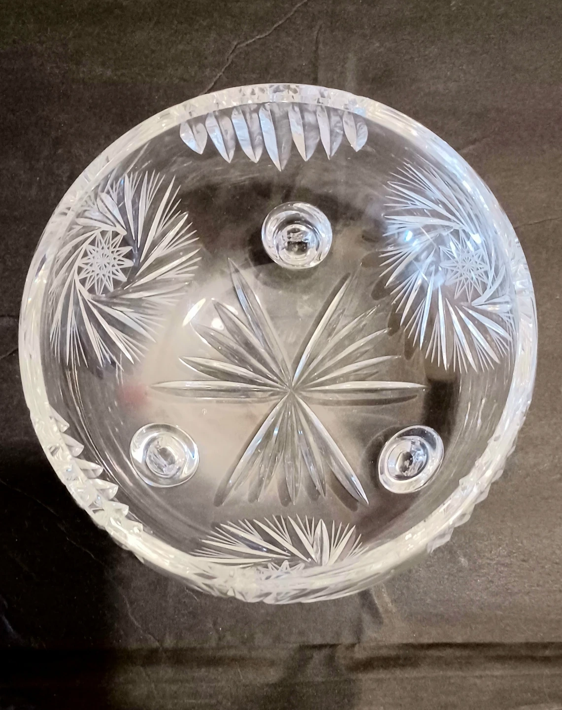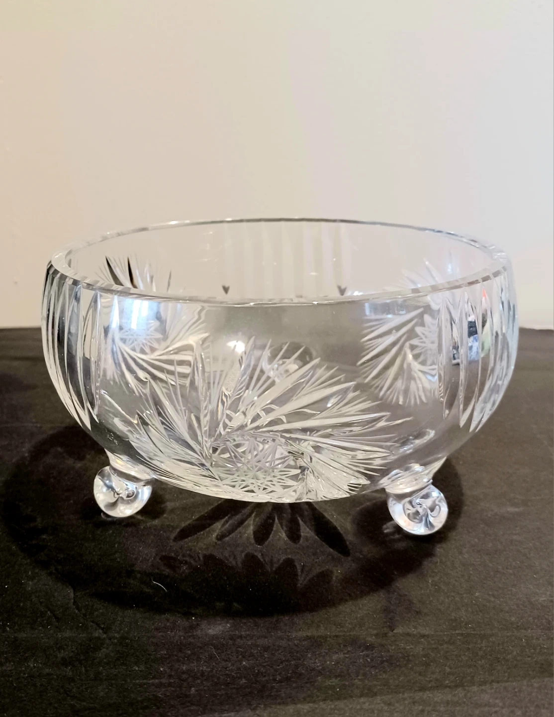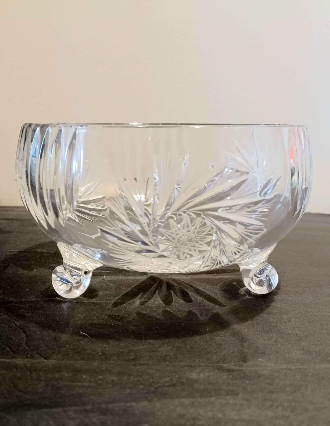 Vintage Mid Century Bohemian , Hand Crafted Lead Crystal High Clarity & Brilliant Sparkle Bowl with a lovely Starburst pattern and stands on three Curved Decorated feet.