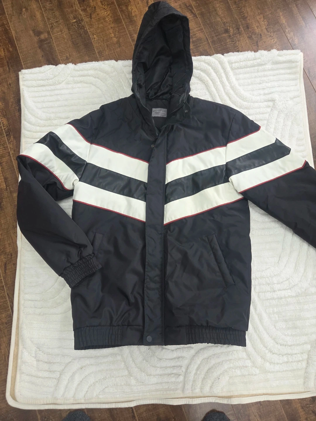 This is a Zara Man black jacket with white and red stripe accents. It features a full zip closure and a hood. The jacket has elastic cuffs and hem.