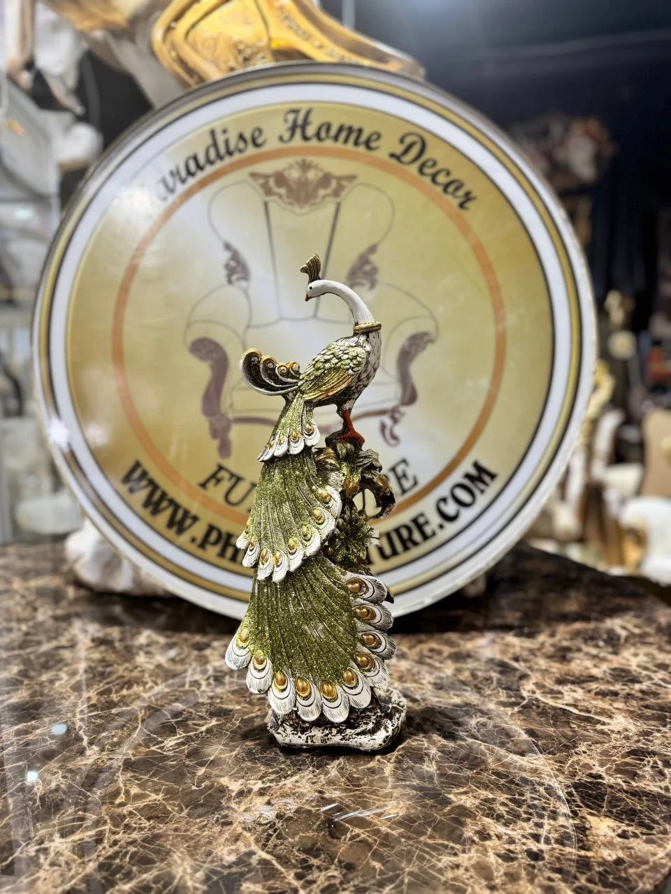 This is a decorative peacock figurine, perfect for adding a touch of elegance to any room. It features intricate details and a vibrant green and gold colour scheme. Made of high-quality material, it's built to last. This unique piece would make a lovely gift or accent for your home decor.