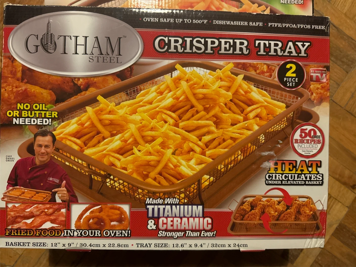 Selling a brand new Gotham Steel 12" Round Crisper Tray! It's a 2-piece set, perfect for making crispy fried food in your oven without oil or butter. The basket size is 12" x 9" / 30.4cm x 22.8cm, and the tray size is 12.6" x 9.4" / 32cm x 24cm. It's made with titanium and ceramic, making it stronger than ever! Oven safe up to 500°F and dishwasher safe